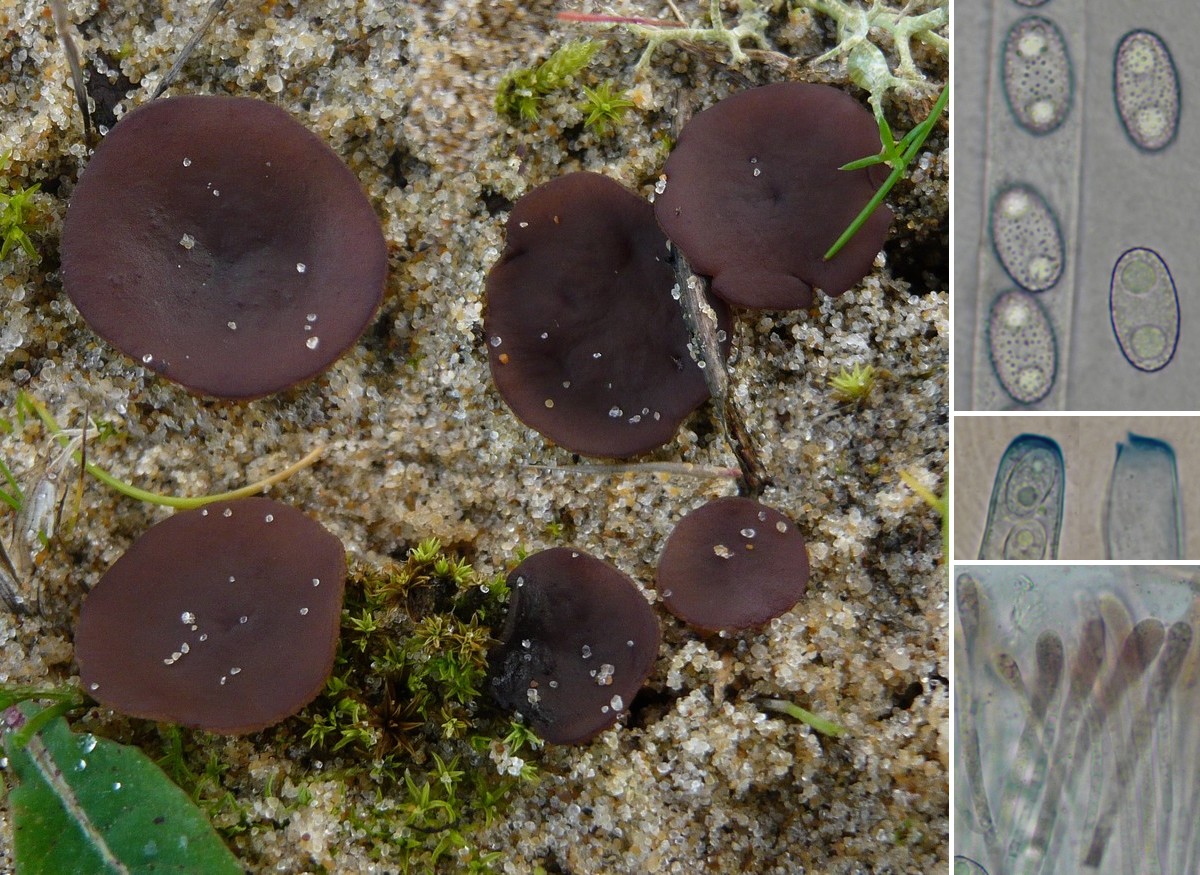 récolte sur sol sablonneux dans l'arrière-dune du littoral atlantique, apothécies jusqu'à 15 mm maximum. Spores 15,5-16,5 x 9-9,5 µm, couvertes de verrues isolées. Asques à réaction WTR, base avec crochets.
