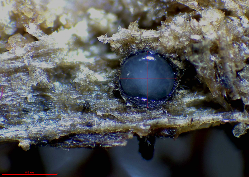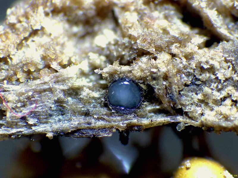A tiny ascomycete found embedded in wood in a very advanced state of decomposition, appearing beneath some specimens of Hemitrichia clavata.