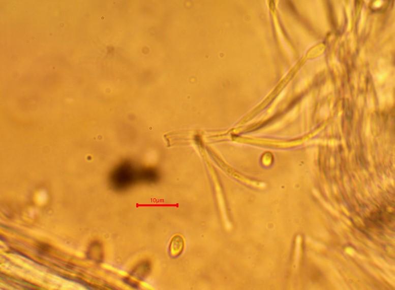 Une anamorphe rose stipitée, très nombreux synnema, stipe surmonté d'une tête globuleuse, stipe velu brun rouge plus foncé en bas, avec excroissances simples hyalines cylindriques à sinueuses, obtuses, à paroi épaisse parfois uniseptées, plus nombreuses vers la base, qqs unes plus longues branchues et septées (1-3 cloisons) à l'extrême base, le stipe de textura porrecta, hyphes colorés vers l'ext et incolores à l'int., hyphes stériles du stipe septés semblent pénétrer à l'intérieur du capitulum, capitulum conidiogène, conidiophore verticillé, conidies hyalines ou peu colorées, rose en masse, à paroi épaisse, ellipsoïdes lisses, 5-6x2.5-3.5µ, se formant à l'extrémité des branches du conidiophore, sur tronc mort debout de feuillu (frêne ?), en boisement riverain de Chalosse (40)
