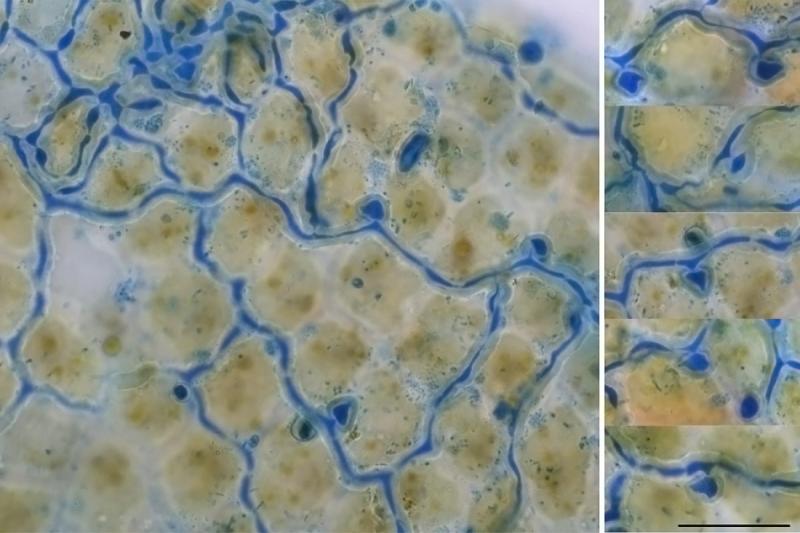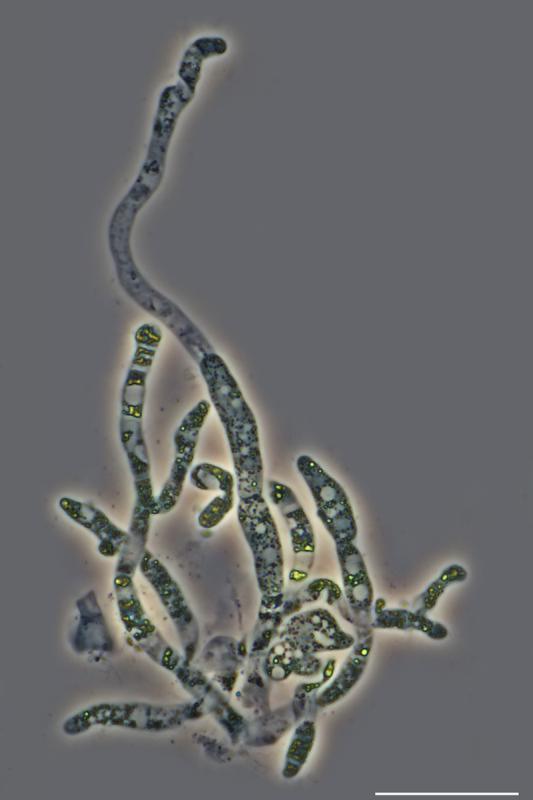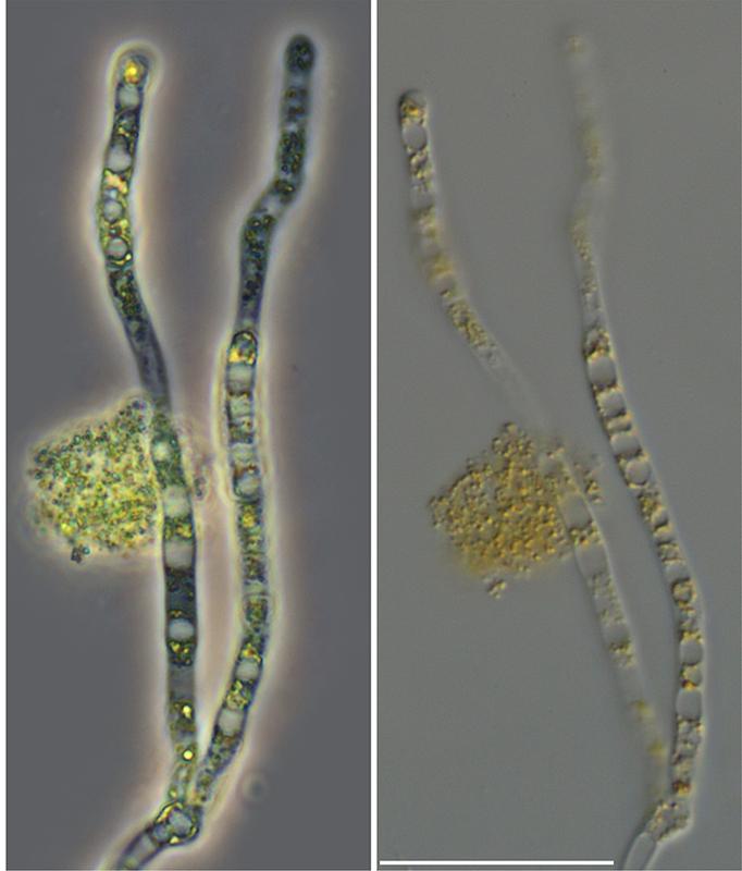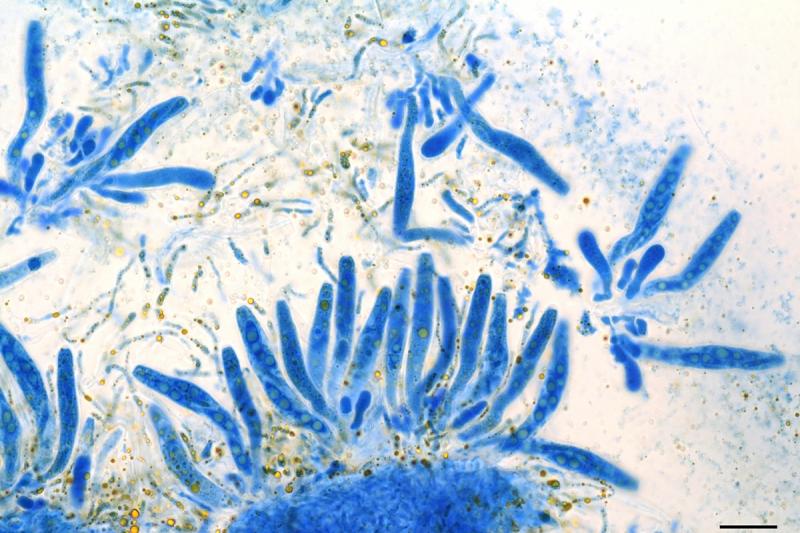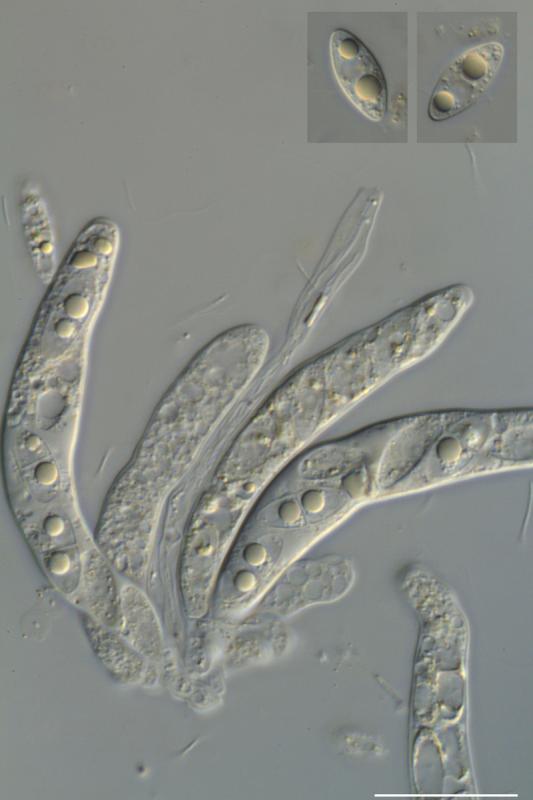 Seine Fruchtkörperchen lassen sich schon im Feld mit einer 10x Handlupe erahnen. Vor allem wenn die Lebermoospolster nass sind, kann man zwischen deren Oberblätter kleine hellgelbe Fruchtkörperchen erkennen die dort hervorlugen . Trocken sind sie eher dunkelgelb. Sie sind klein, auf einen halben mm liegen oft 3-4 nebeneinander. Die Oberfläche der FK ist mit Hyphen überzogen dies zeigt sich wenn mit Baumwollblau gefärbt wird. Ein weiteres Merkmal ist die unregelmässige Anzahl Sporen in den den Asci: sie können 4 / 5/ 6/ 7 sporig sein. Die Sporen sind glatt, einmal septiert und haben Oeltropfen.