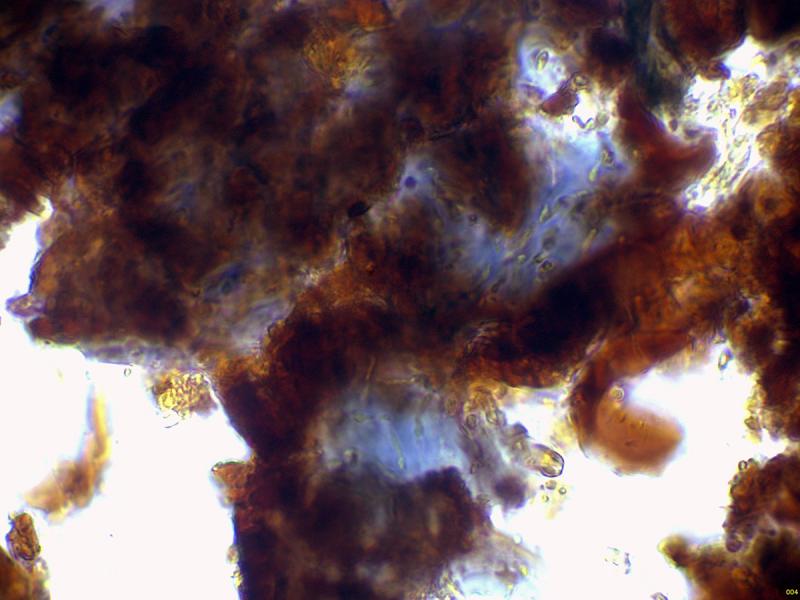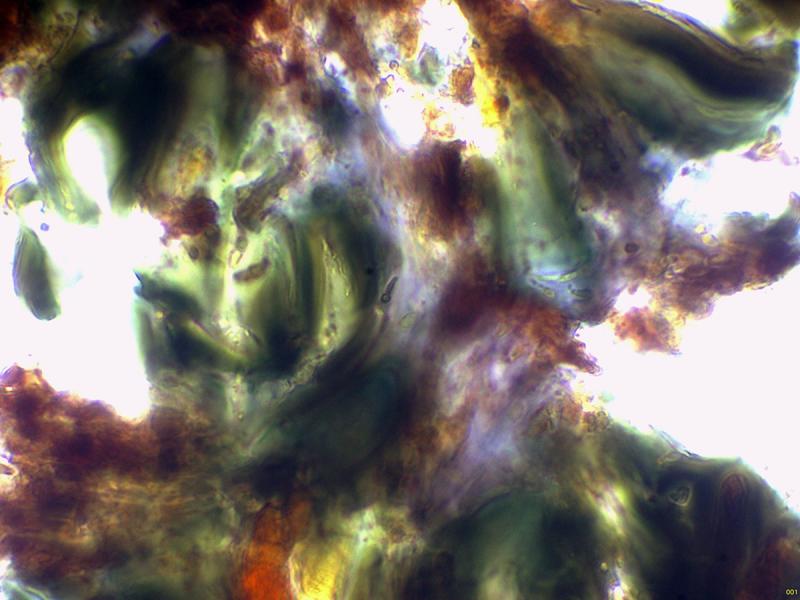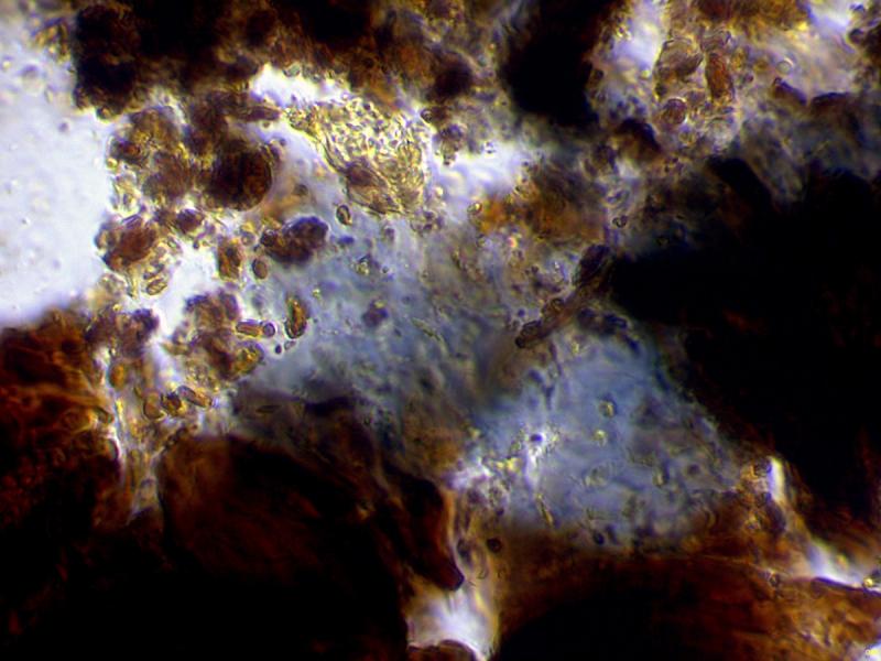 Scattered asci with multiple spores inside, apparently more than 100 ascospores per ascus; these asci show no reaction to Melzer's reagent. Filiform, septate paraphyses with pigmented amorphous material on their surface, which do not protrude above the level of the asci.