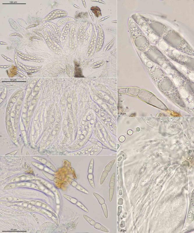 These thiny, blackish pseudothecia grew on the bark or just below the surface of slender Corylus branches still attached to the tree. Barely papillate or convex, they form large, bitunicate asci with a very short stem. The spores are very large, bicellular, hyaline or very pale yellowish-brown when mature, and they are surrounded by a very broad, ephemeral mucous sheath.