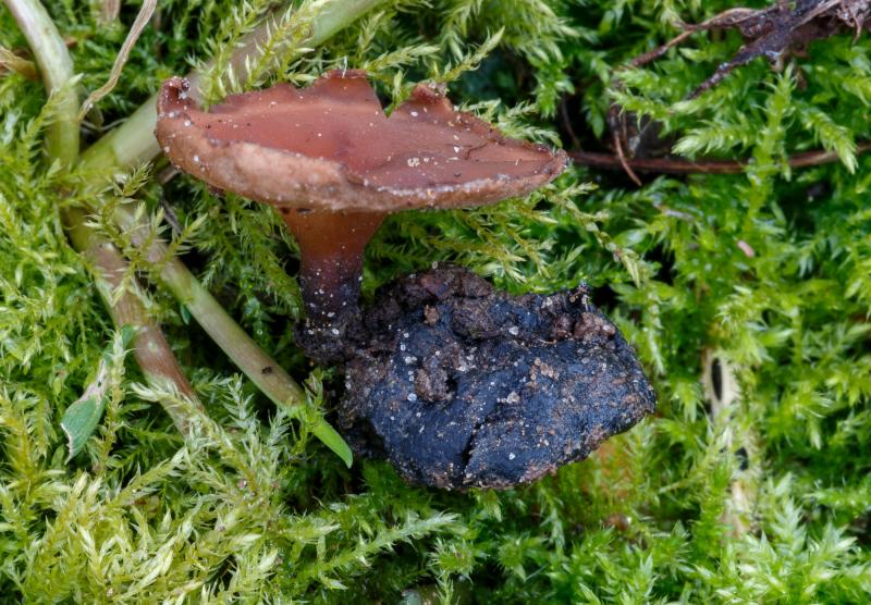 The mushroom was attached to a superficial buried sclerotium and clung to the roots of a young Ficaria verna plant.