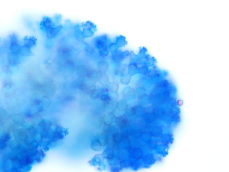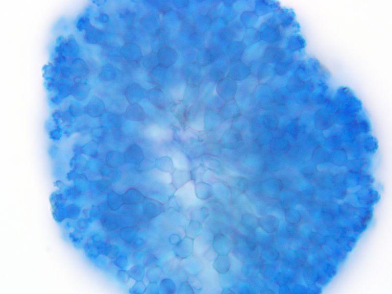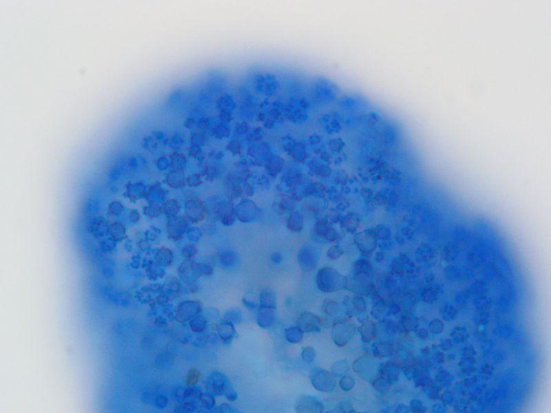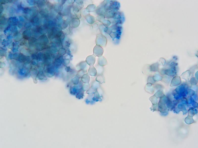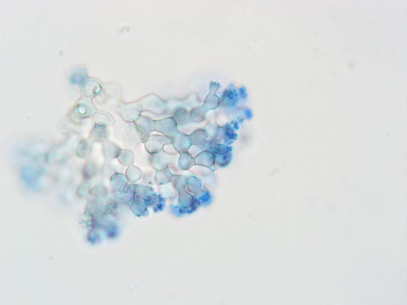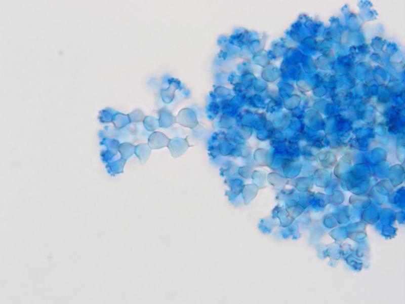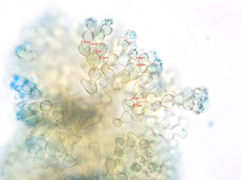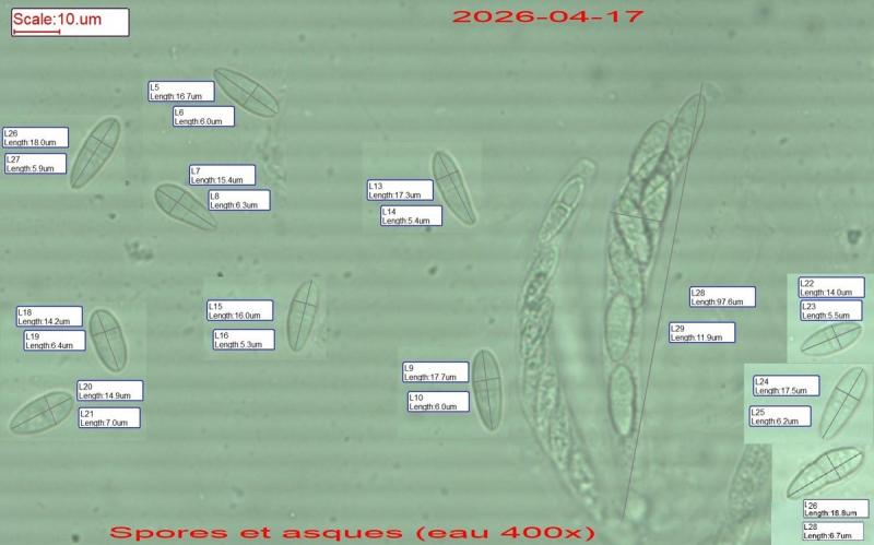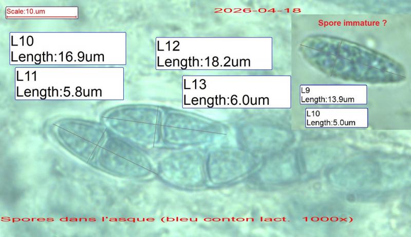 Ascospores (6-) 7-9 x 1,5-2,5 µm bacilliformes, lisses, un peu amyloïdes dans le Lugol, bleu aux extrémités, (uni-)bisériées dans l'asque.