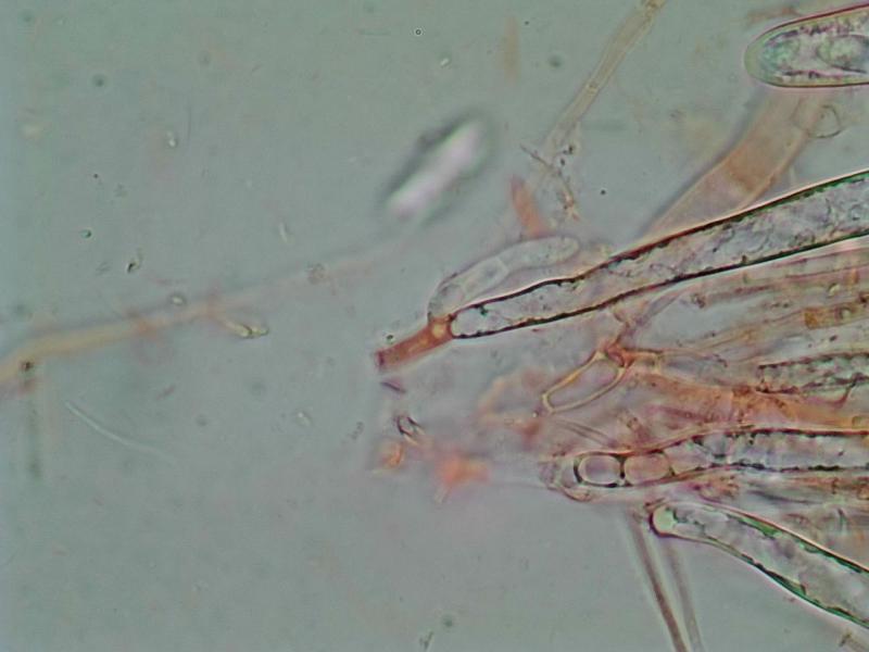 I couldn't observe any structures in the prepared samples that could correspond to hairs. The closest thing were the terminal hyphae visible above the image of the excipulum, which might correspond to marginal hyphae. There were no live paraphyses either. The apothecia were past their prime, and there were only asci and a collapse of spores. Since I have quite a bit of material from this sample, if we can't reach any conclusions, I'll send it for sequencing in my next shipment, which would be next year.