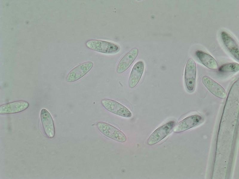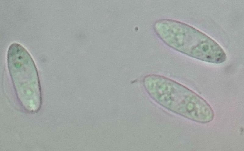 Octosporous asci, with an amyloid reaction in their apical apparatus, and although difficult to observe in some of these asci, I thought I saw croziers. Fusiform ascospores with pointed ends, two or three large lipid droplets and several smaller ones scattered throughout, measuring in water: