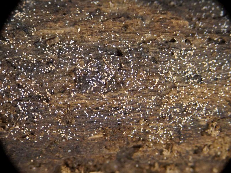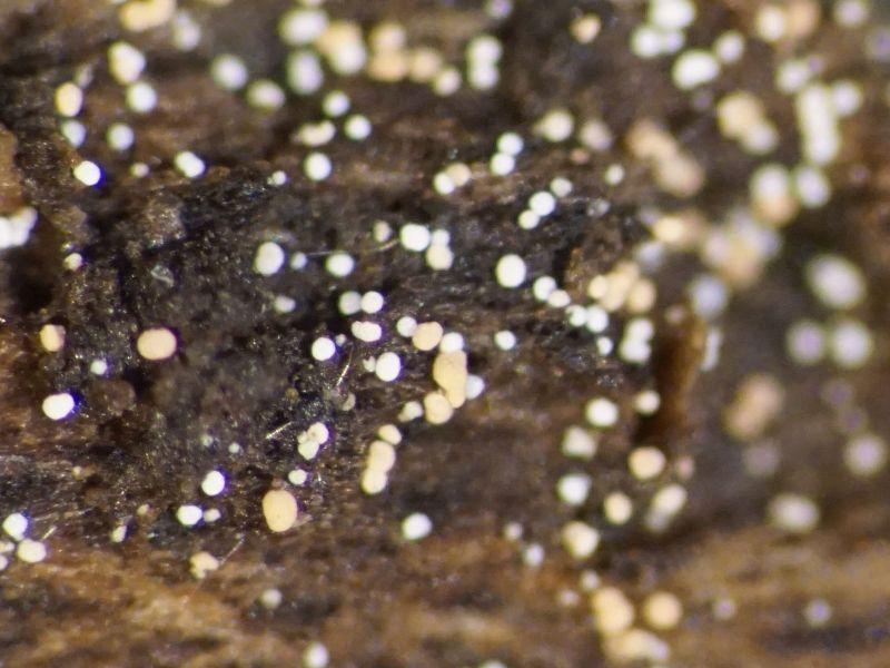 Fructifications minuscules (0,15-0,25 mm) très nombreuses mais non coalescentes, en forme de petite urne globuleuse à ouverture circulaire ou ovale au sommet soulignée de blanc, montrant une striation radiale et ligne claire.