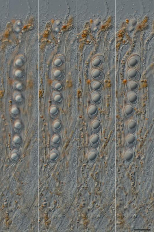 Octospora similis ist ein Bryoparasit. In der Literatur werden Arten der Gattung Bryum als Wirte aufgeführt. Ich konnte in meiner Aufsammlung als Wirt Bryum caespiticium var. badium bestimmen und daran an an den Rhizoiden die Gallen finden, die durch die Infektion gebildet werden.