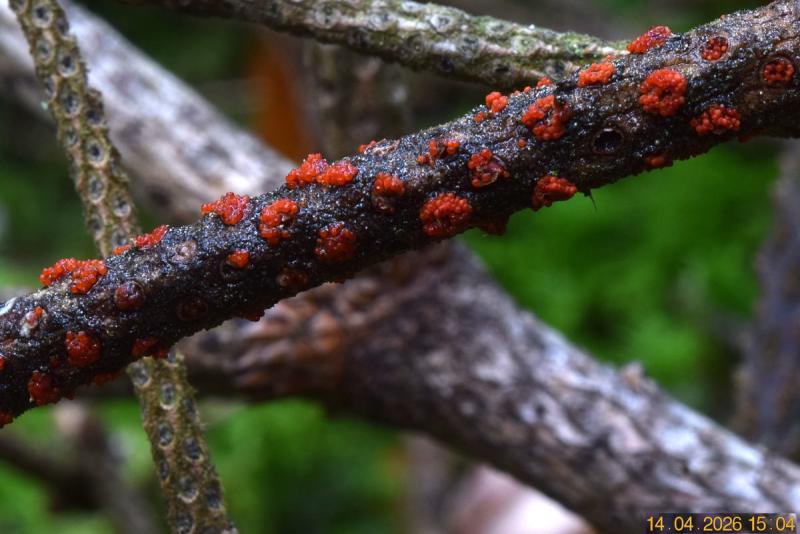 Spécimens récoltés le 26.04.26 dans le Val-de-Ruz, à Pertuis, coordonnées suisses 560'561 E, 210'888 N, sur tige herbacée (Dicotylédone, Filipendula ?, Apiacée ?) dans une zone de mégaphorbiaie peu après la fonte de la neige.
