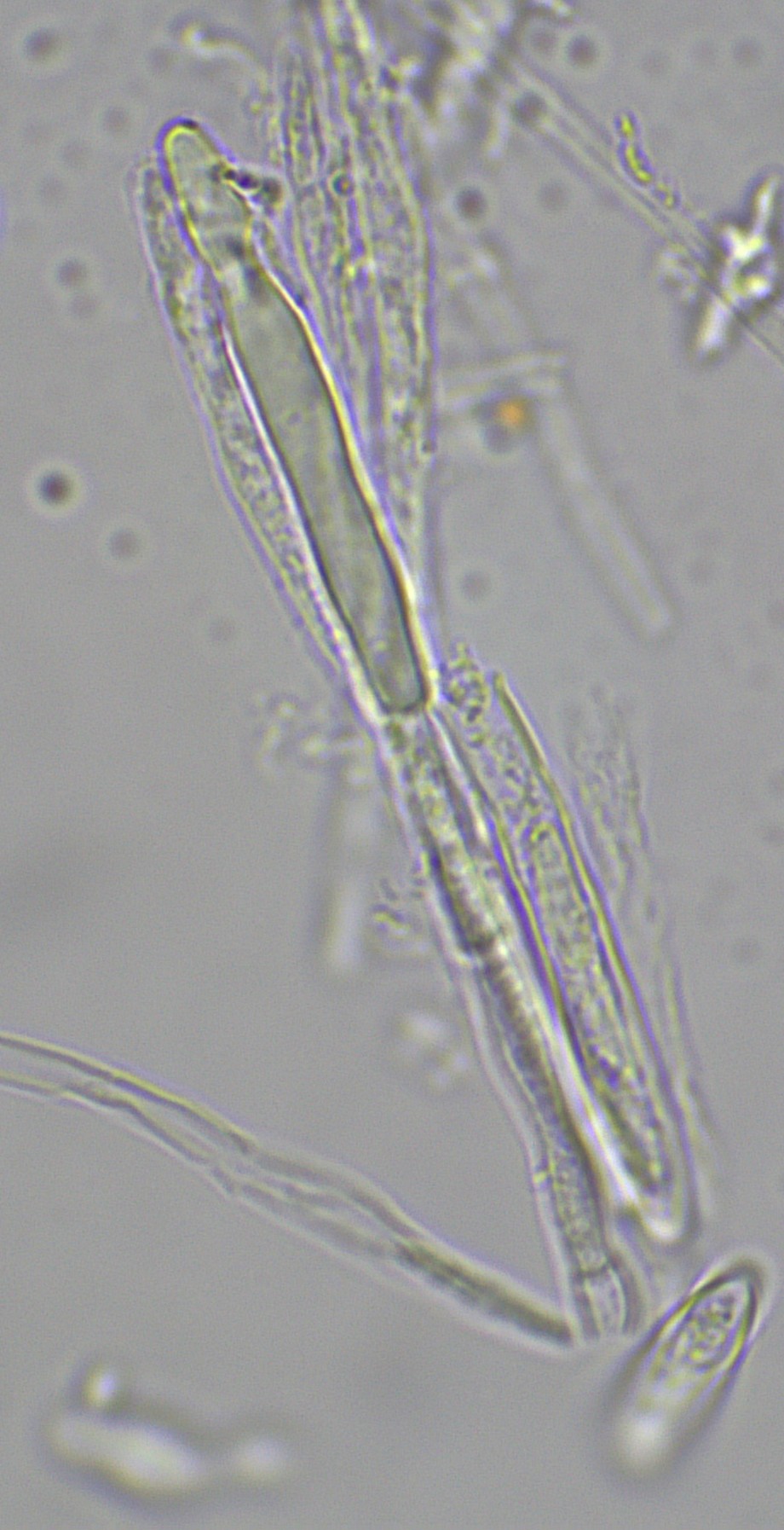 Chlorociboria glauca on indet. decorticate logThe