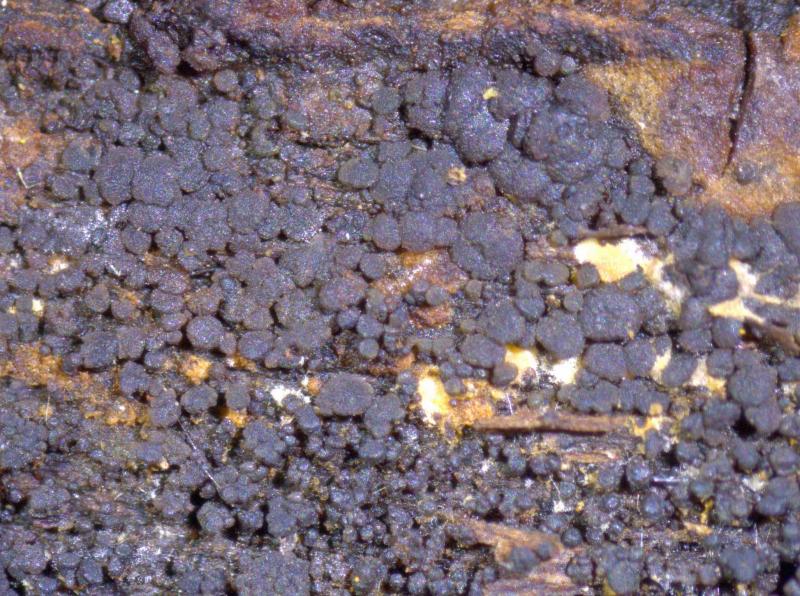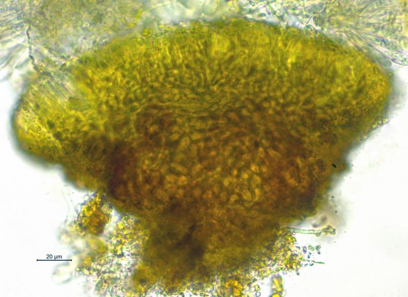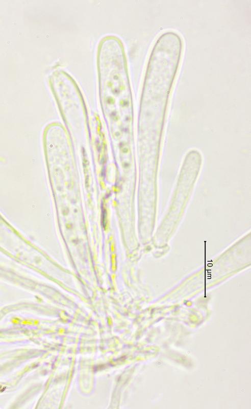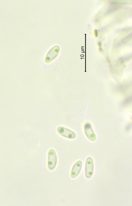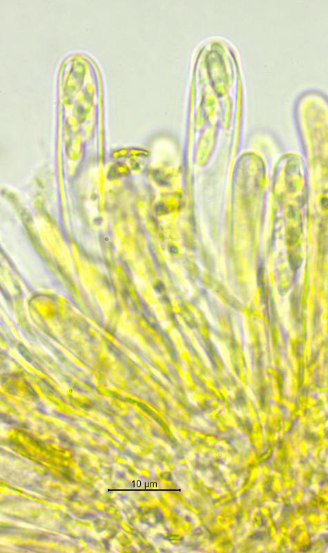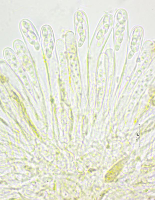Apothécies de 0.25 – 0.6mm de diamètre, grégaires, sur branche morte de Berberis vulgaris (Lisière de forêt à 731m), Hyménium brun, Spores 4.8 - 7 x 1.8 – 2.5 µm, unicellulaires, hyalines avec généralement 2 gouttelettes, Asques inamyloïdes, à 8 spores avec crochets, 46 - 67 x 5.5 - 7 µm, paraphyses droites, hyalines, partiellement ramifiées, réaction KOH ionomidotique. Je pense qu'il pourrait s'agir de la même espèce que l'on trouve dans les dossiers de Zotto sous le nom de "Skyttea bigutt narrow spores". Merci pour vos commentaires.