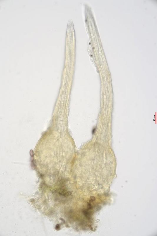 Perithecium: subglobose, amber-coloured and occasionally with thick-walled, septate hyaline hairs about 5 my wide. At the transition to the rostrum partly with thin-walled, hyaline hairs about 2 my wide. Rostrum distinctly lighter in colour (clearly demarcated), slightly conical, very long and slender. Apically pointed. Straight to slightly curved.