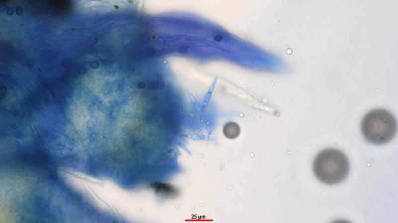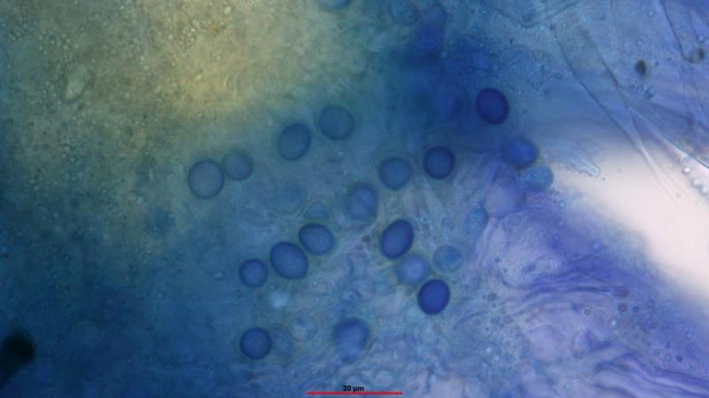 A very difficult type that is rarely encountered and it is even rarer to find it on a Pezizale. It seems that some spores have a spot on the more rounded side and that the asci have more than two or three spores. Is this correct?
