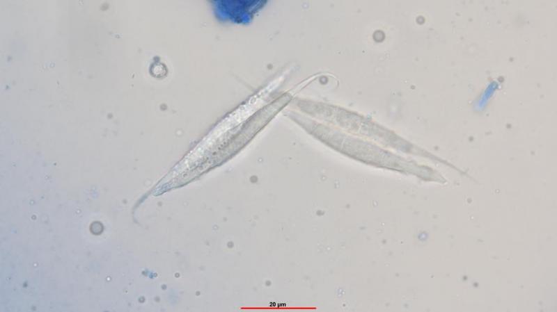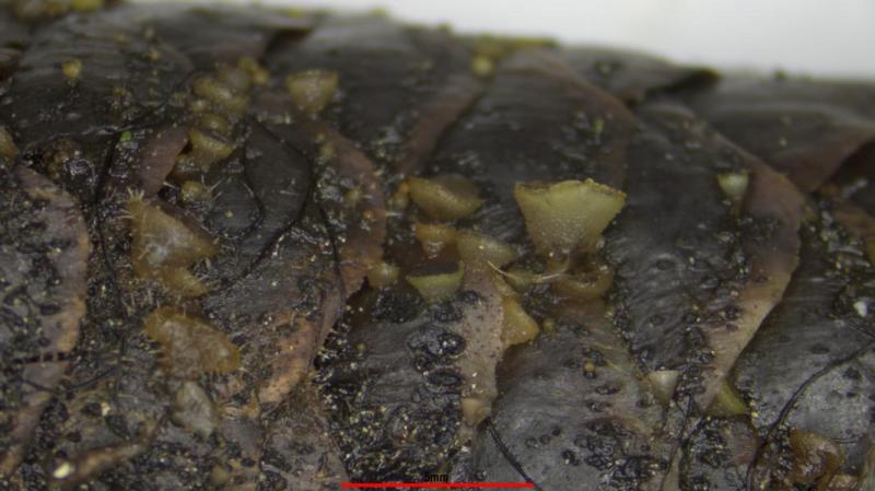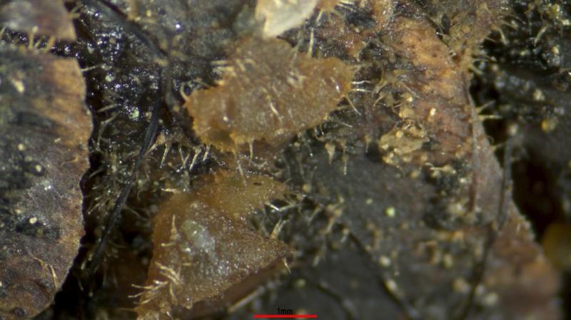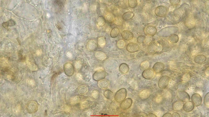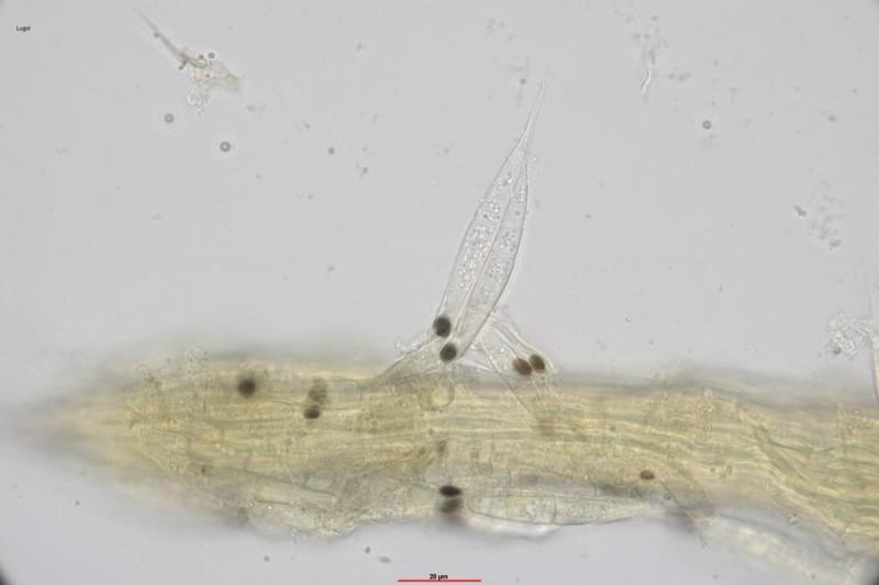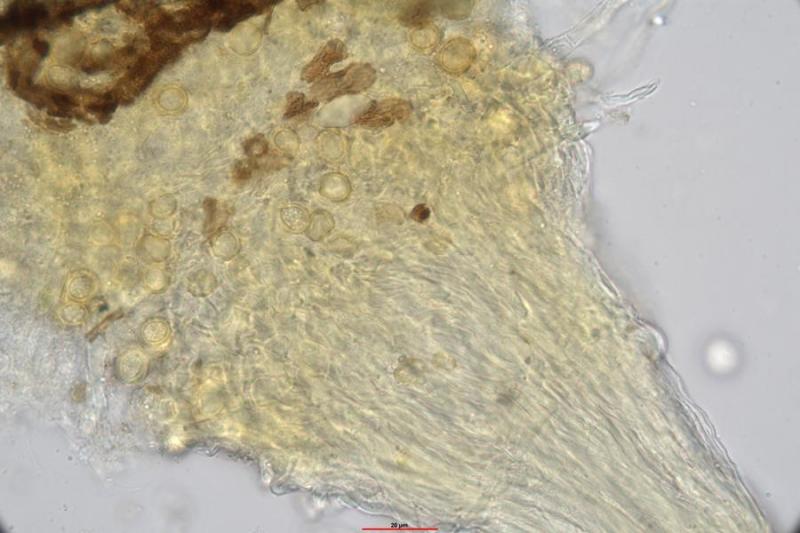 Peridia: At the base with rectangular cells. The cells are thin-walled and become increasingly square and polygonal towards the rostrum. Some of the cells are almost round. On the outside of the peridia are partly thick-walled, roundish to oval elements that are caynophilic. I cannot judge these elements.