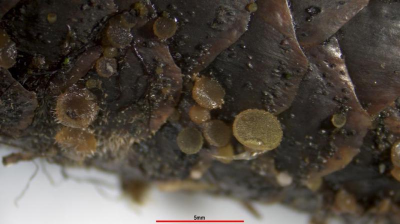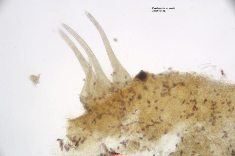 At home I noticed that many small perithecia of another Ascomycete had grown on the Ascobolus and the cone. It took me some time to come to the genus Pyxidiophora.
