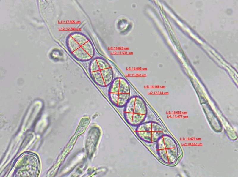Poussant sur les lamelles. Spores 16 - 17 x 11 - 12,5 mu.