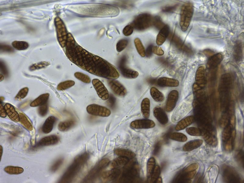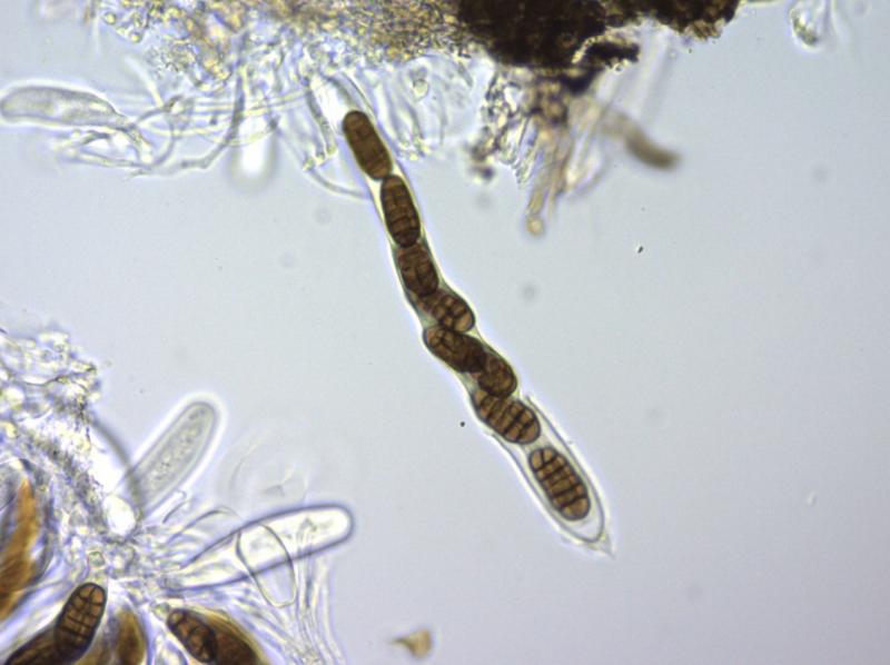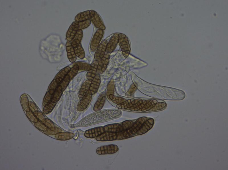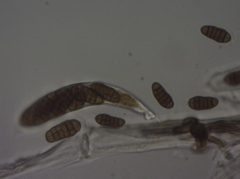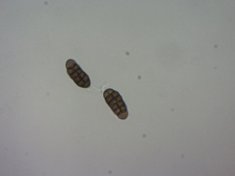 Spores were strawcoloured, with 5 transverse septae and 2-3 longitudinal septae and measured 27x11.5.