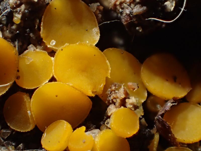 A small group of these were found in a patch of damp soil. Orange/Yellow Spores were smooth with no internal guttules. and were 15-16.5 x 9-9.7. Asci had no reaction to Meltzers. Paraphyses were granular and swollen at the apex.
