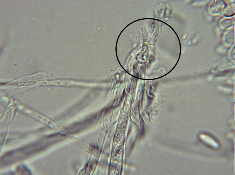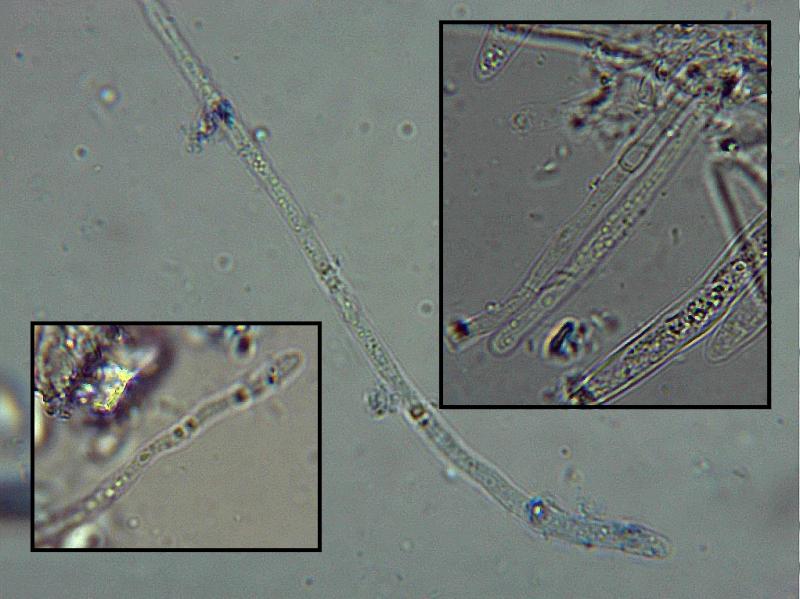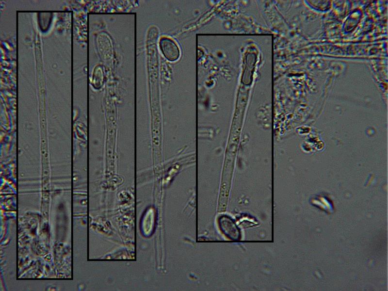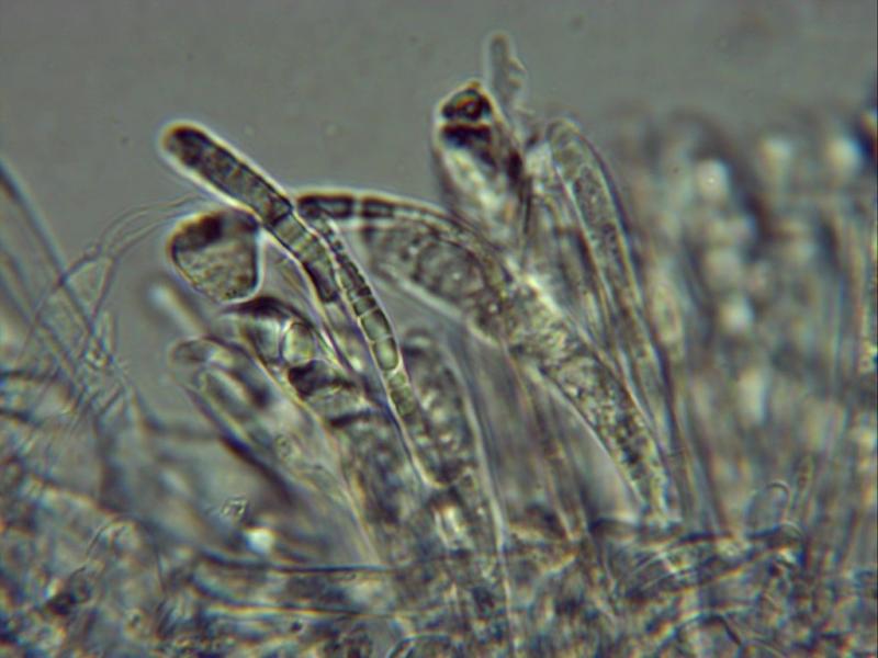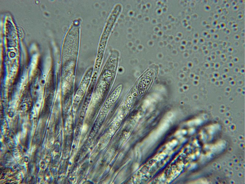 Paraphyses: 10 µm ± above asci, cylindrical rounded tips, tapering up with 2-septa, filled mostly upper sections VB's, some highly refractive, some with granular exudate tips.