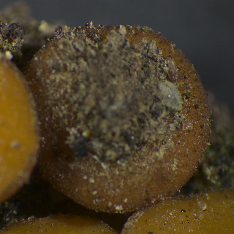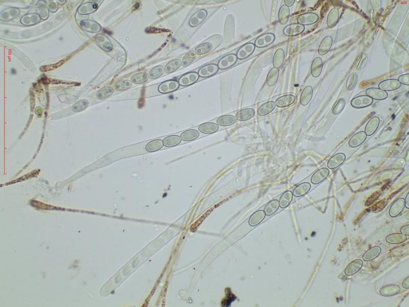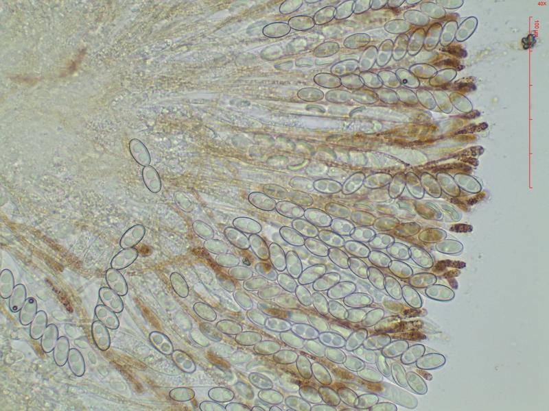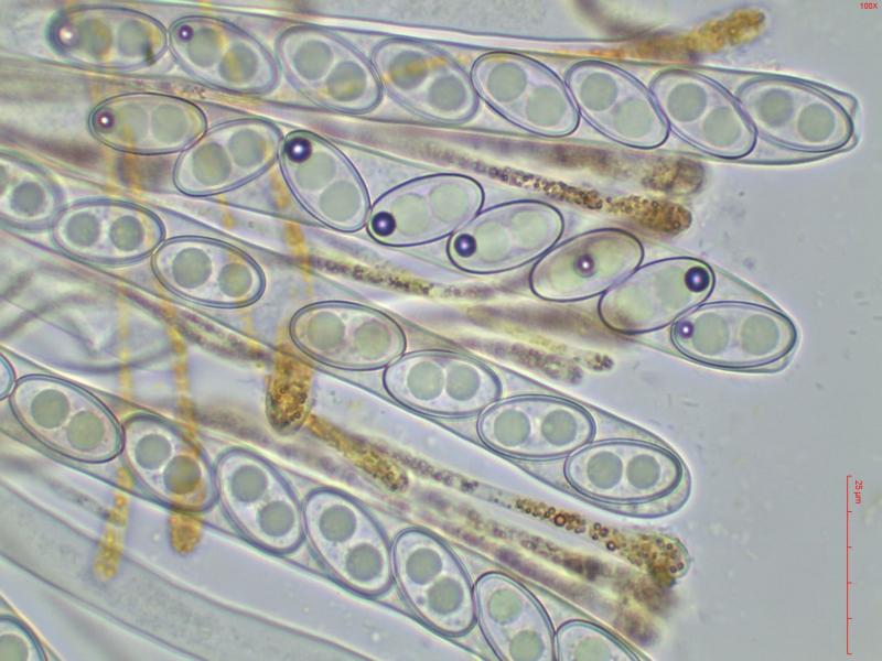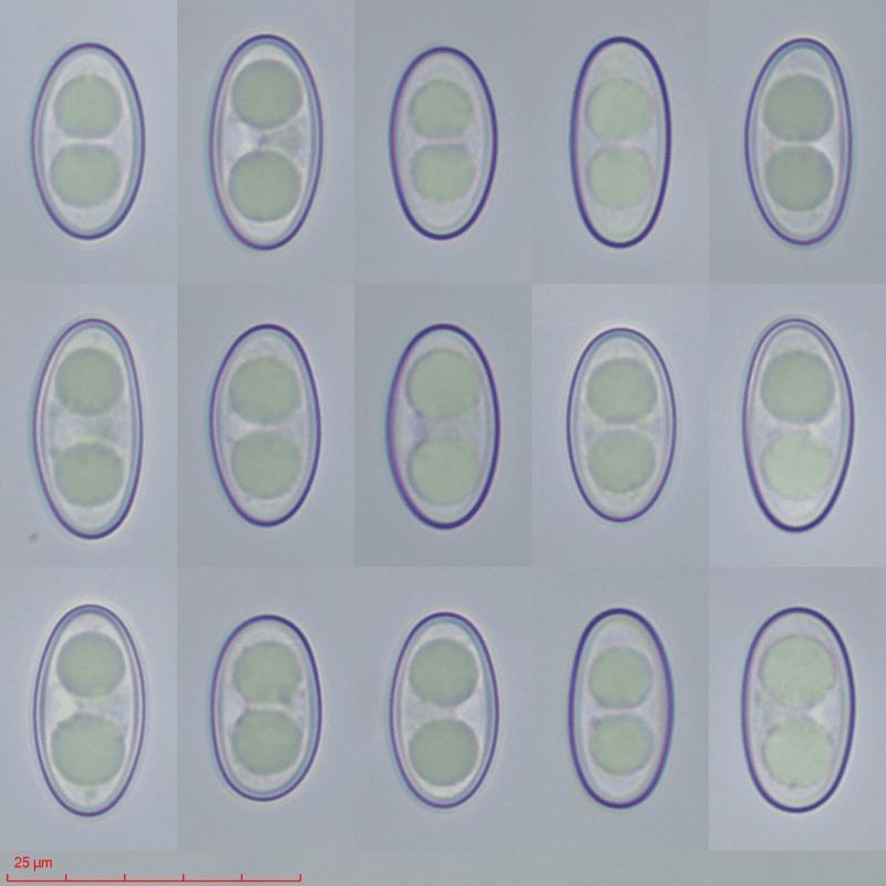 Ascospores ellipsoïdes à légèrement fusoïdes [16.5 ; 18.0] x [9.0 ; 9.5]µm soit Qmoy = 1.9 avec constamment 2 grosses guttules.