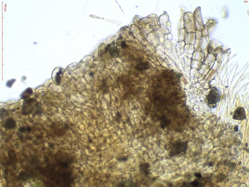 Poils marginaux présents : la dernière cellule est toujours nettement clavée et large (>15µm, souvent jusque 20µm). A partir de mes préparations, j'ai du mal à définir où s'arrête l'excipulum et où commencent les poils marginaux ; je vous laisse apprécier leur longueur ainsi que leurs septa.