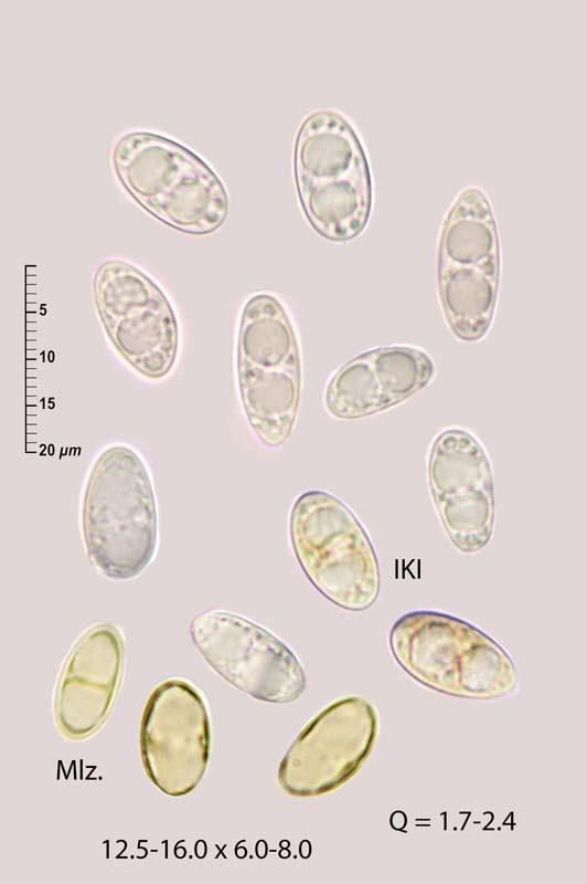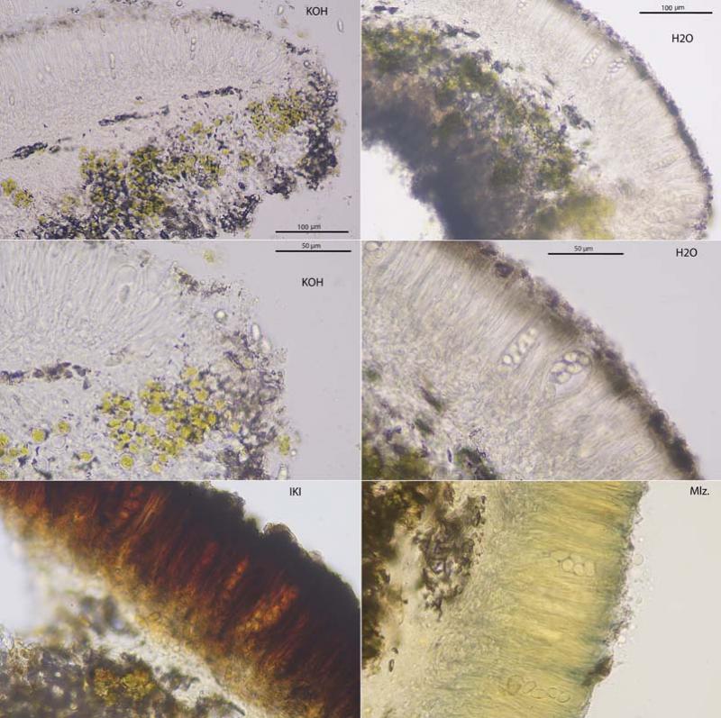 I have rejected the idea that it could be Lecanora albella because the margin of its apothecia is not yellow K+ and L. carpinea because the margin of the apothecium is also P+. The spore measurements and thickness of the hymenium fit the description of L. varia but it was not determined whether or not it had a cortex in the amphithecium.