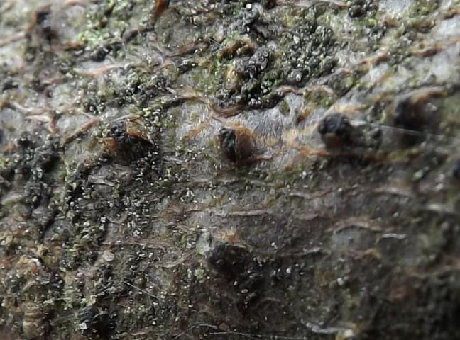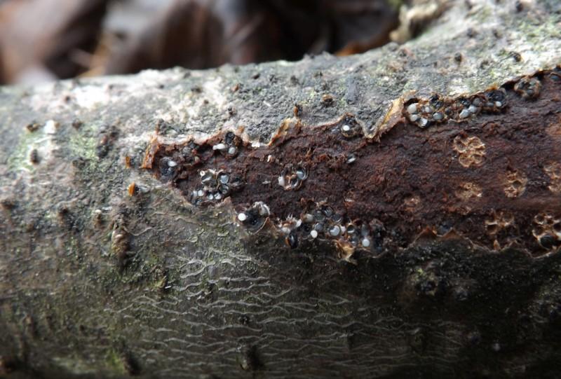 Pyrthecia growing on the cut branches of the shrub. Probably Salix or Prunus padus.