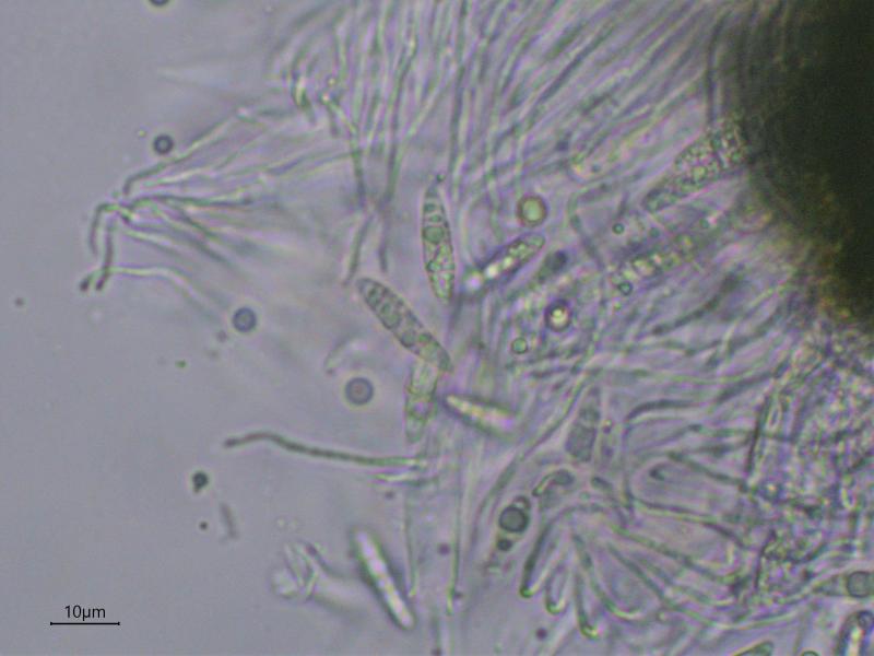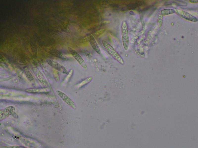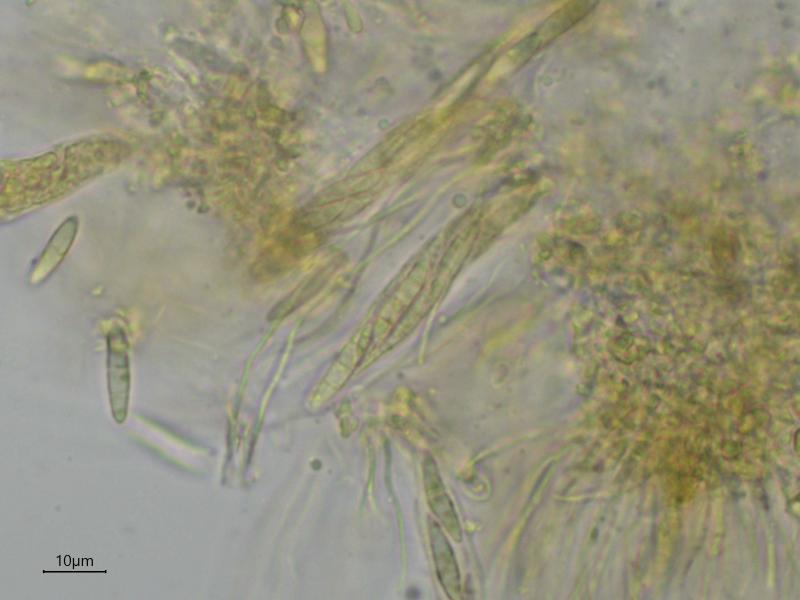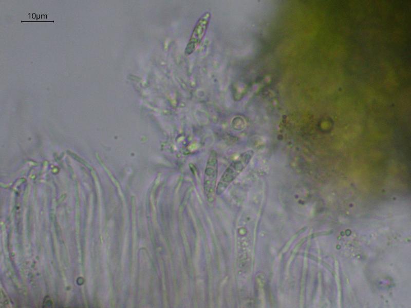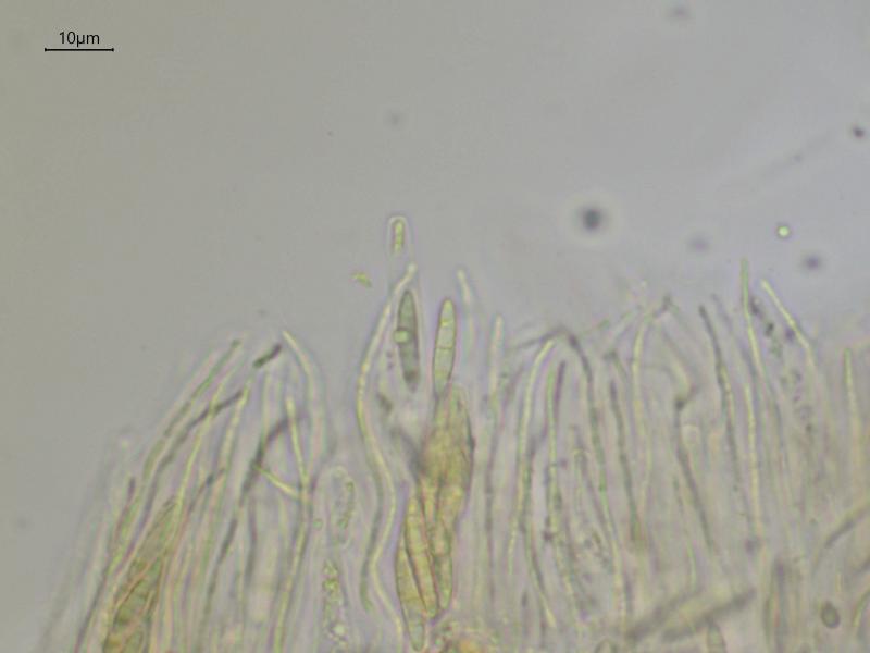 I measured two asci: 55,0 x 9,5 and 61,1 x 9,5 µm. 8 spores per ascus. Spores in water had much refractive content: (16,1-)17,6 - 20,4 x 4,0 - 5,1 µm; average 19,0 x 4,5 µm; Q=4,24. Details of paraphyses, see pictures.