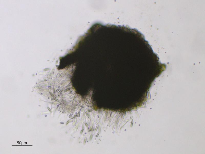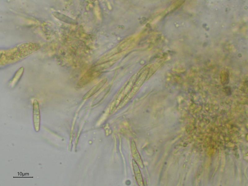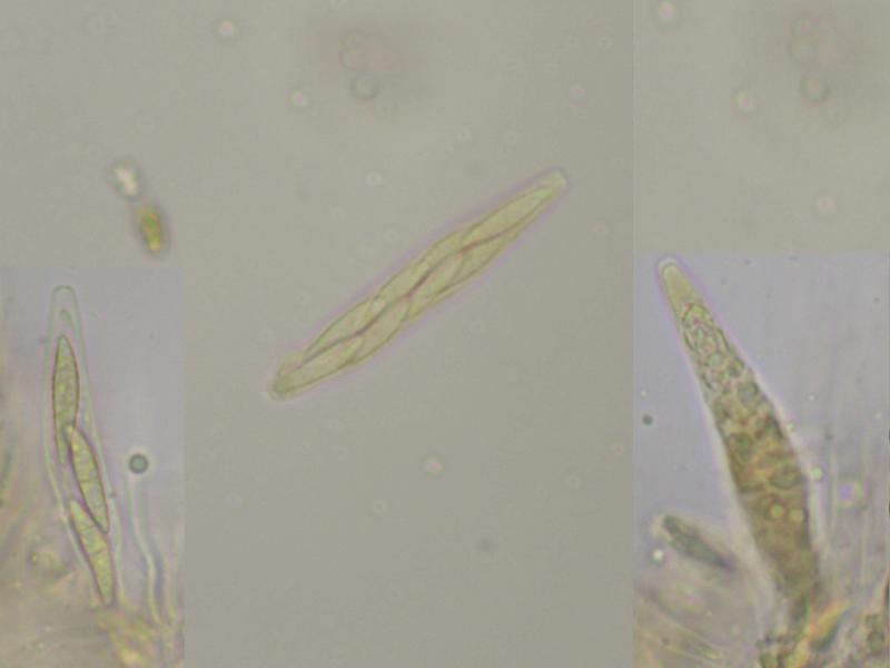 In Melzer's reagens: Asci J-, bitunicate(?). Spores suddenly appeared to be at least 3-septate. Couldn't find a good fit in Microfungi on Land Plants.