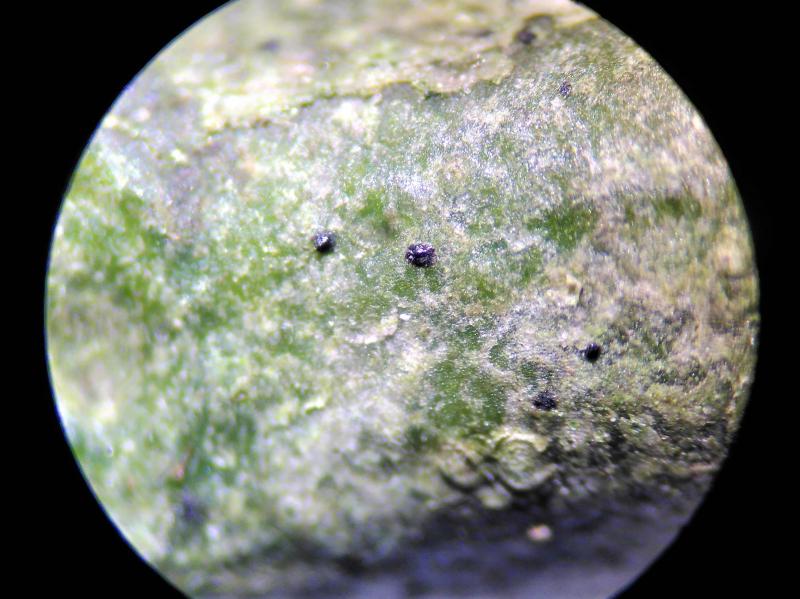 the thallus should contain trentepohlioid alga but sometimes it happens the lichen persists on dying-off stems and twigs and looks like a saprophytic fungus