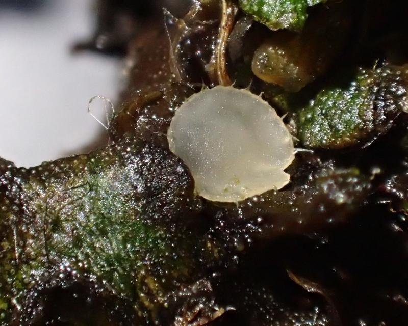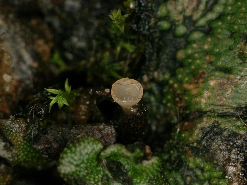 A couple of colleagues collected a whitish disco from living thalli of the liverwort Marchantia polymorpha (subsp. ruderalis). I think this is Pezoloma marchantiae.