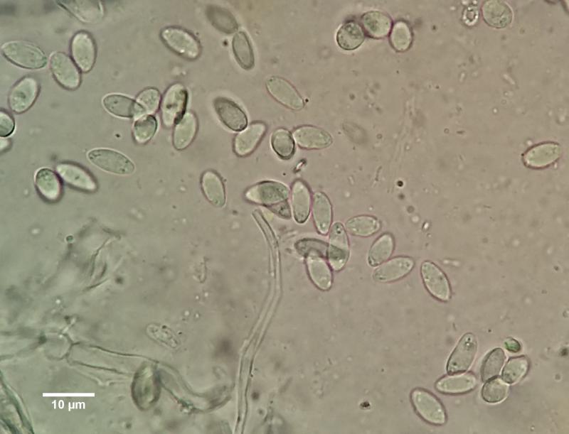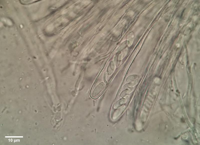 Ascospores lacking guttules with dark spots near the ends (nuclei?). In water, n=20, averaging 8.65 x 4.3. Asci 8-spored, in IKI tips with a faint reddish band.