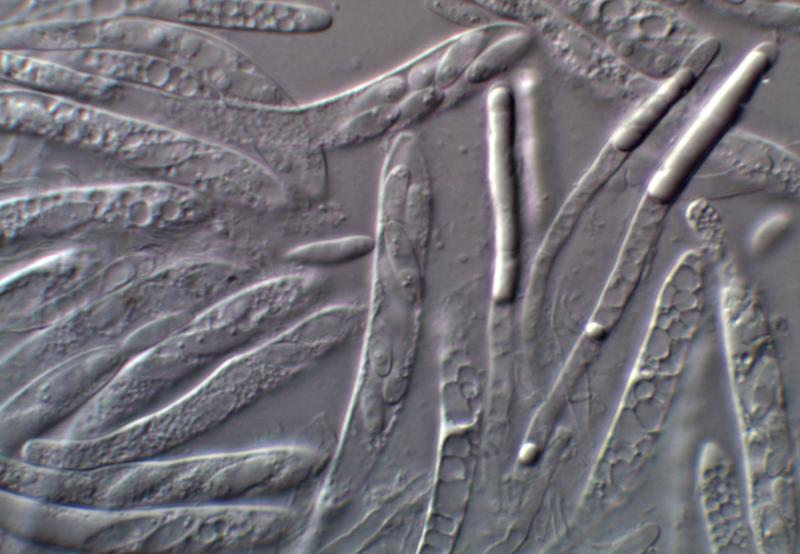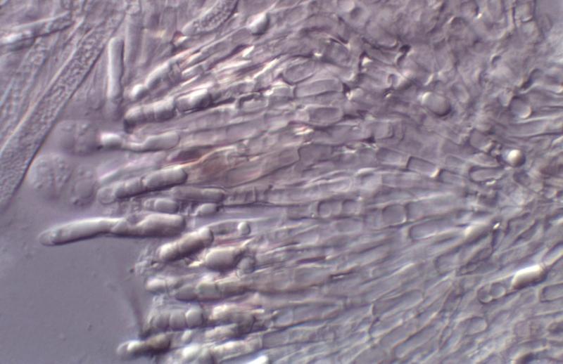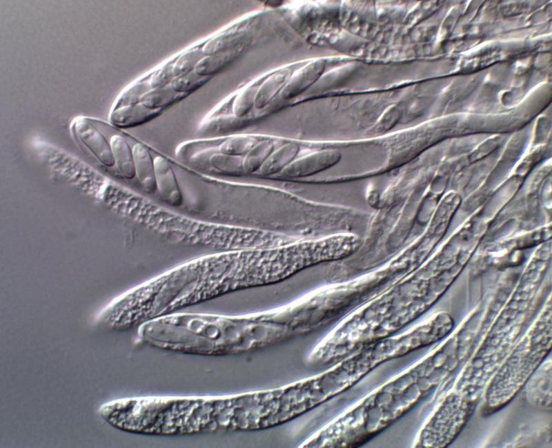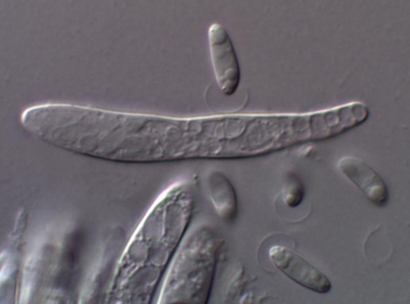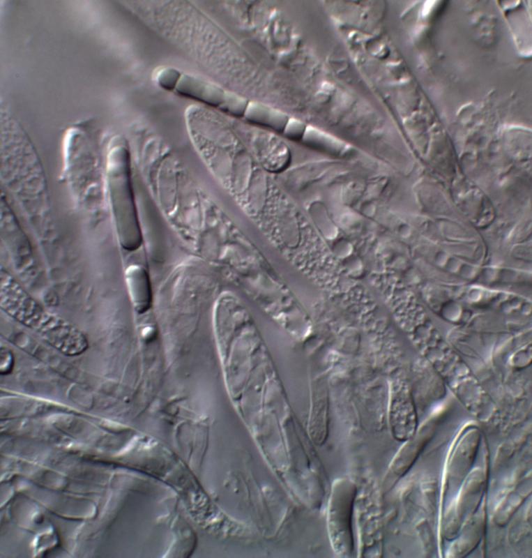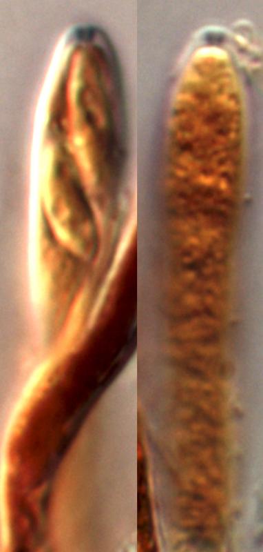 Asci 8-spored, in IKI deep blue, I could not see any croziers. Paraphyses often with extensive continuous to interrupted vacuolar contents. Ascospores (7.2)8.1-8.9 x 2.7-3.2µm, guttules as seen in the images. Enrique Rubio commented recently that many spores of Helotiales, when freshly ejected show a sort of "sheath"; in this instance a number of spores showed a sort of "halo" at one end - see image.