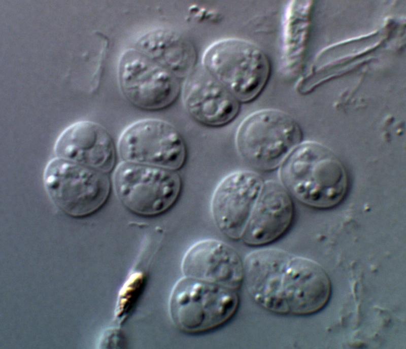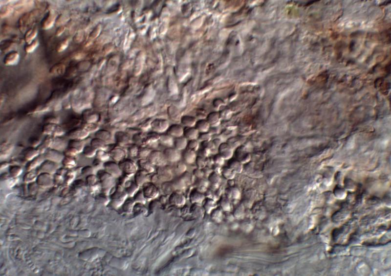 Associated with this apothecium were a number of two-celled hyaline bodies which appear fungal; these can be seen in the final photograph but also in #2.