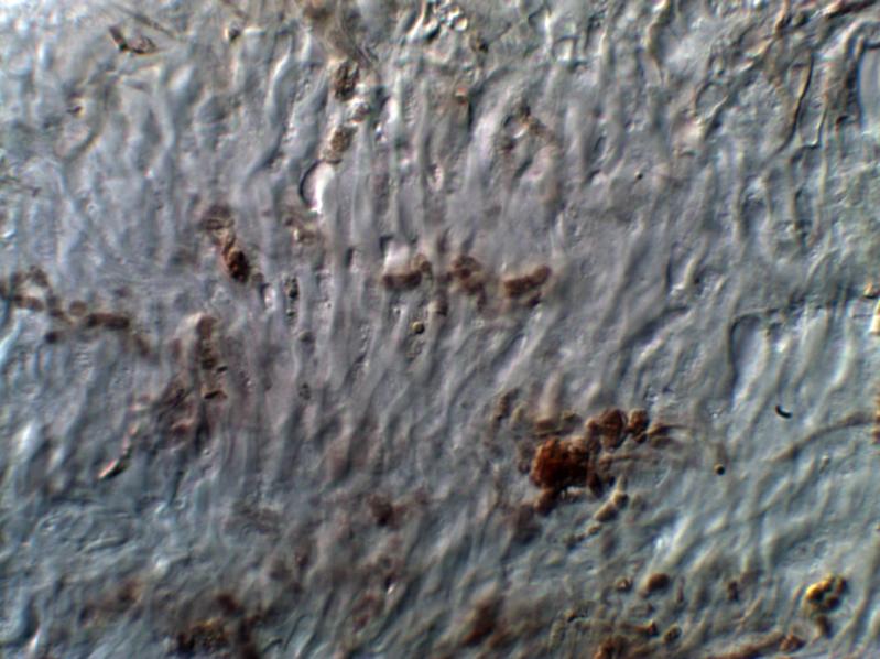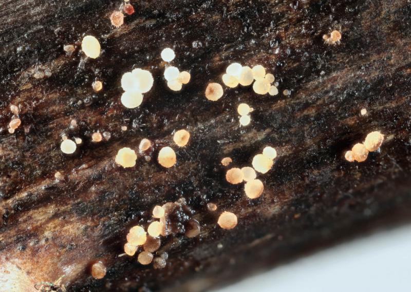 Apothecia subsessile up to 300µm diameter, minutely downy, starting creamy and turning rusty-red, basal cells thick-walled, globose, running into elongated rather glassy hyphae, the terminal excipular cells rather thick-walled and ending in cells with refractive contents as can be seen in the images.