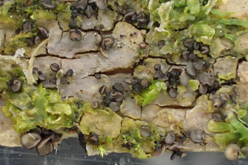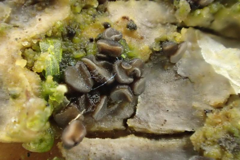 On a l'impression que les apothècies naissent sur des amas noirâtres.