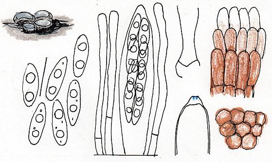 Paraphyses cylindriques, hyalines, non renflées, sans guttules.