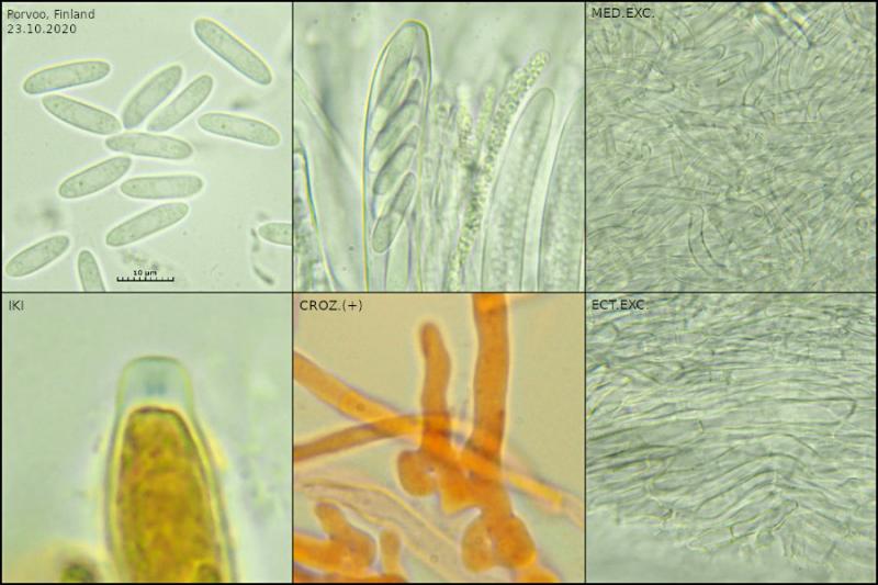 Paraphyses full of small VBs, asci arising from croziers, IKI+. Medulla of textura intricata, ectal excipulum of textura... prismatica? The spores measure 12.4-17.2 x 3.6-4.3 micrometres.