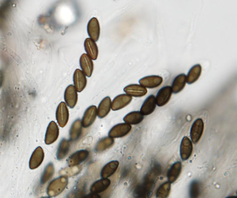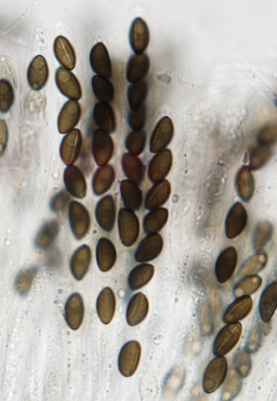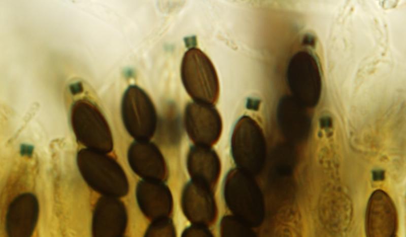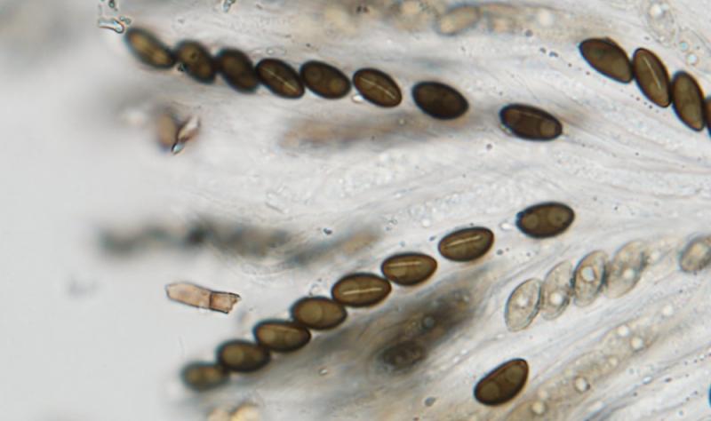 The ascospores measure about 8.5–11.5 x 4.7–5.4 µm. They have a germ slit that is often clearly shorter than spore length.