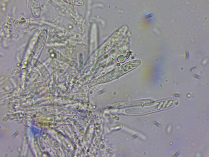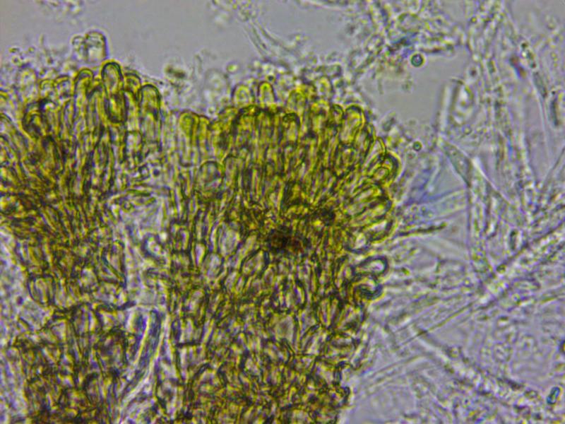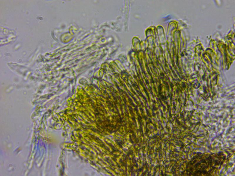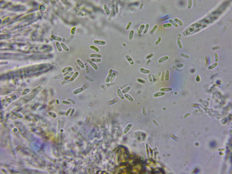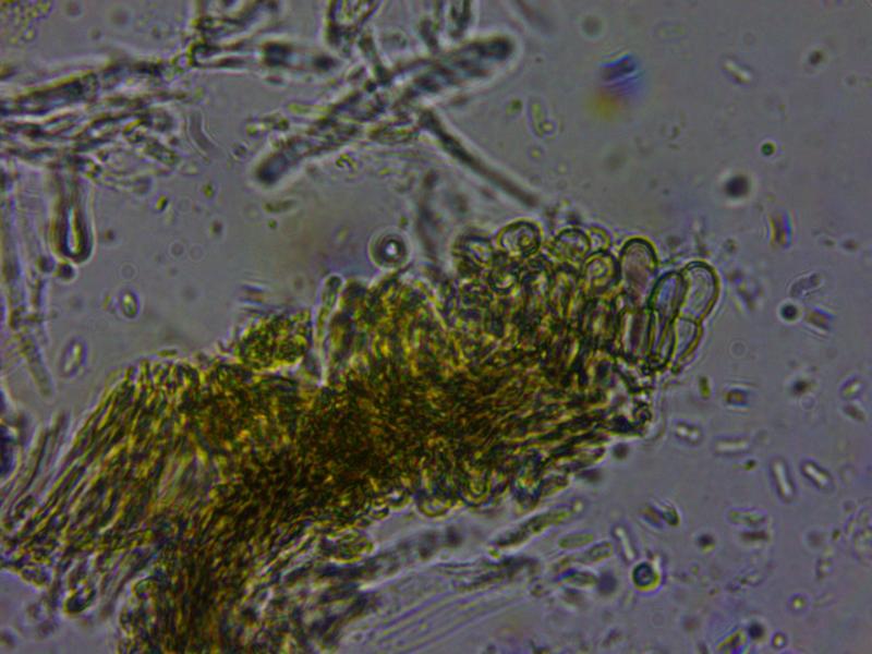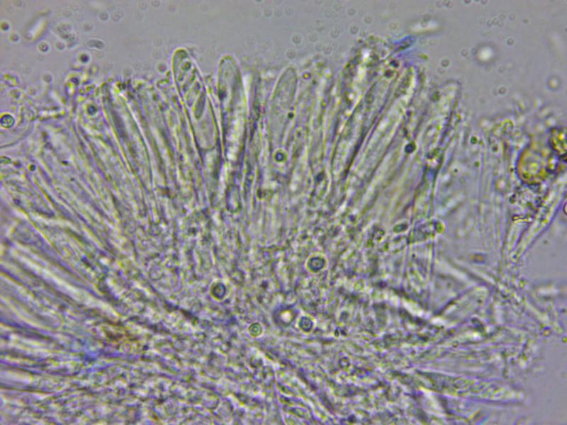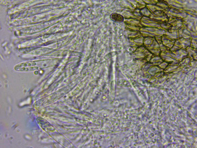 .. in the Alps, montaneous region, on deciduous wood, 23.6.20. The yellow-green apothecia grew together with other discomycetes, mainly Mollisia spec. (not examined).The asci are about 35-40(45)/4-6 µm and bear croziers, react weakly blue in IKI (minute porus). The spores are about 4,5-6/1,5 µm large, with oil about 2. The excipulum is a brown globulosa with chains of brown cells at the ends.