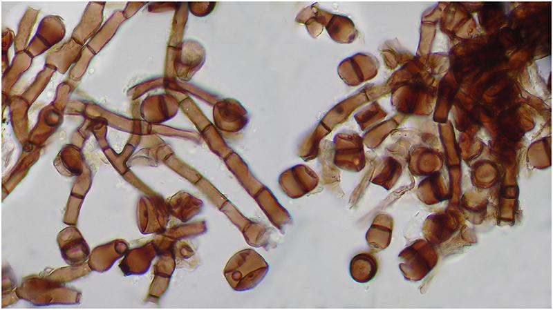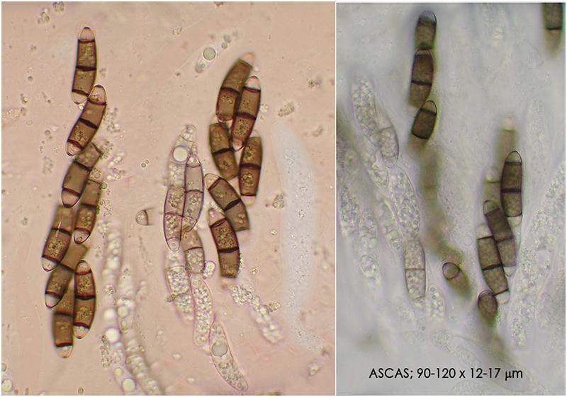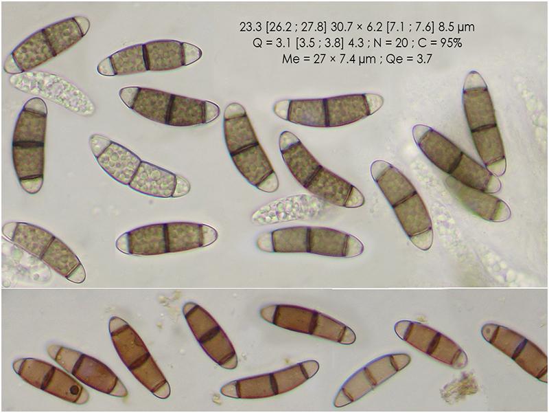 La esporas poseen 3 septos, las dos células centrales son pardo verdosas, con gran cantidad de gotas pequeñas en su interior y las dos células de los extremos son hialinas y sin gútlulas.