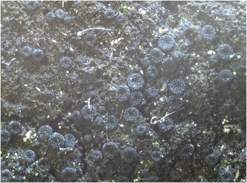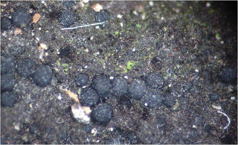He encontrado estos peritecios que crecían semiinmersos, en grupos numerosos, sobre una "alfombra" de hifas pardas que tapizaban una rama de planifolio caida en una zona húmeda de regata. Tienen forma globosa, la superficie al secarse se vuelve algo concava. Tiene aspecto verrugoso.