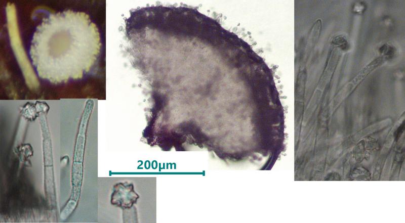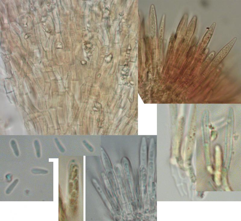 This fungus was growing on an old leaf of Vaccinium myrtillus(?) attached to a dropping of elk (Alces alces) in a boggy habitat, just a few minute scattered apos. Finland. Spores 4.7 - 5.6 × 1.4 - 1.9 µm; asci approx. 25 x 3-4; paraphyses lanceolate, about 45 x 5; ectal excipulum textura prismatica.