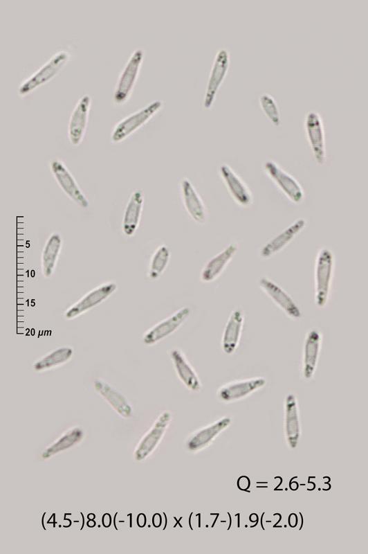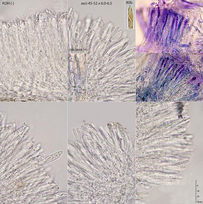 The paraphyses have small vacuoles that stain in cresyl blue, but do not contain the large cylindrical and refractive VBs typical of the genus Mollisia.