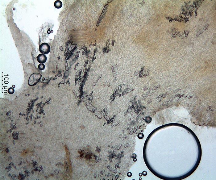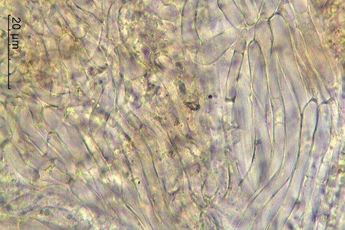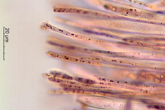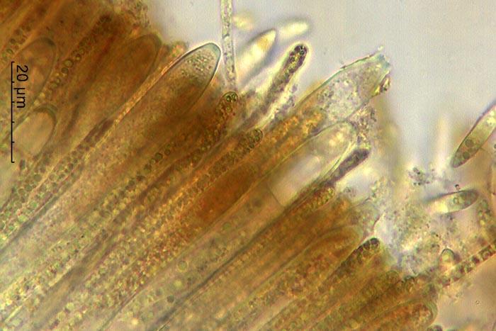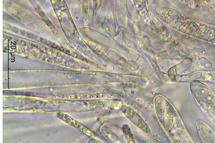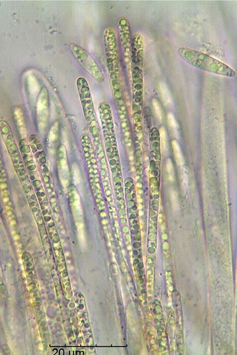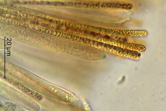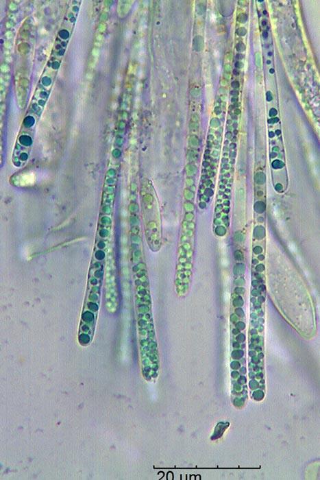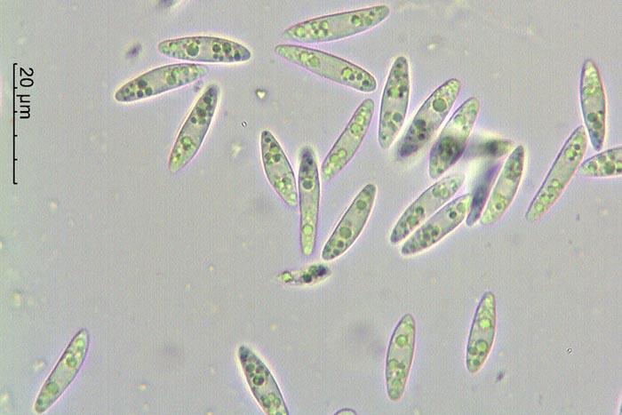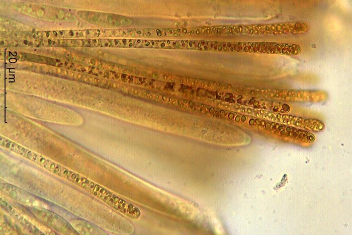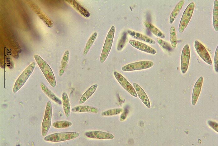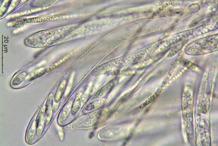 Esporas recién expulsadas de 12-18 x 3,6-4,5 micras, alguna con 1 septo trasversal.