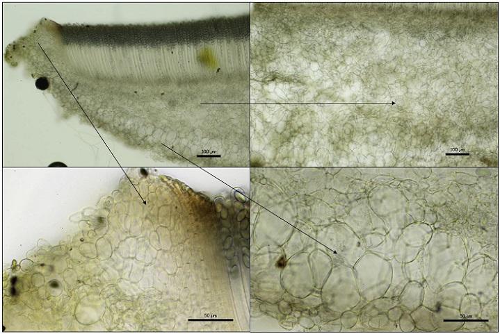 Todo el excípulo está compuesto por células globosas/angulosas, siendo más grandes las células del excípulo ectal.