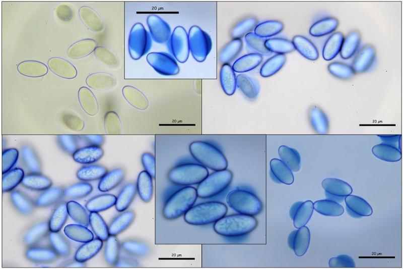 Esporas elipsoidales, lisas en H20, en CB presenta una ornamentación dudosa??? Es posible (creo) que se trata de un defecto de la vaina que recubre la espora y no sea una verdadera ornamentación, si bien es cierto que la mayoría de las esporas presentan en mayor o menor medida está ornamentación a modo de retículo incompleto, el perisporio es completamente cianófila.
