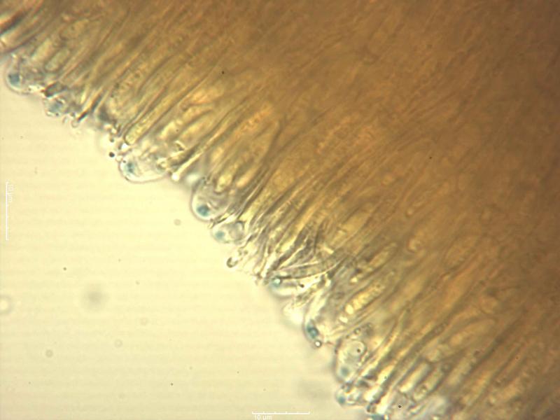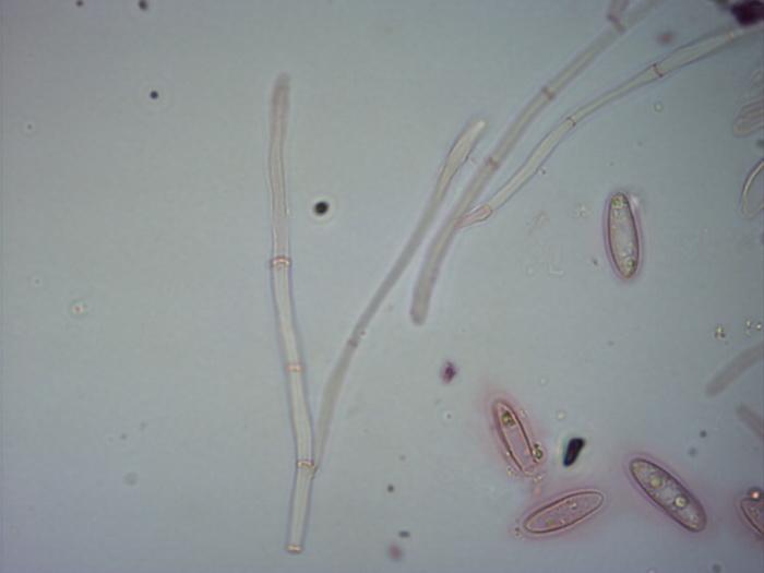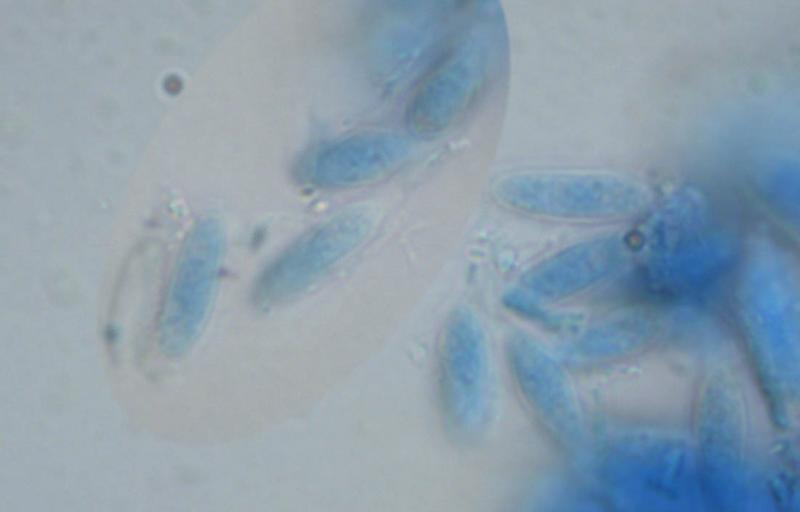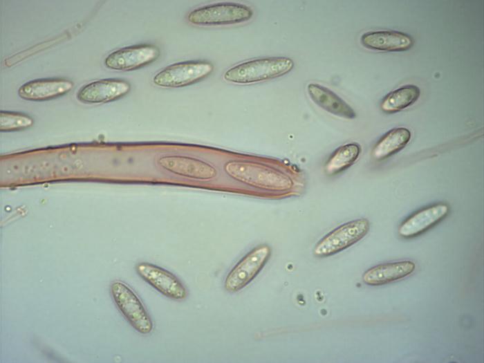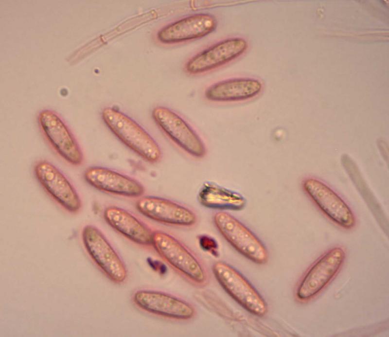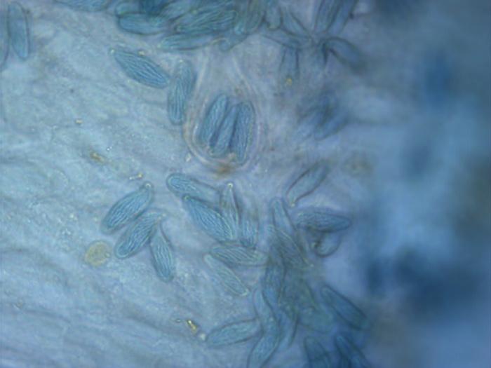 Spores 12-17 x 3,5-5 µm, fusiformes, striées dans le bleu de coton, bisériées.