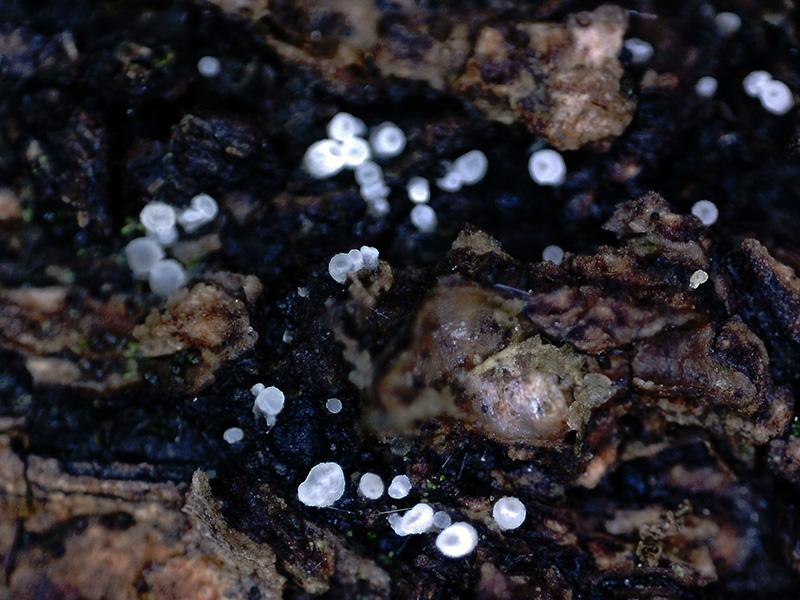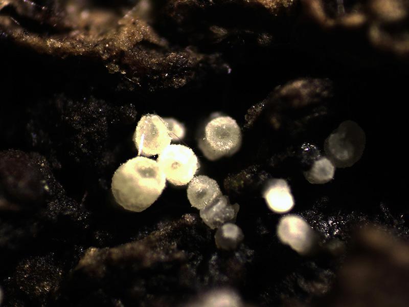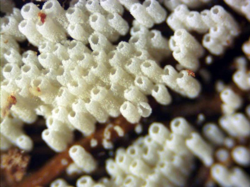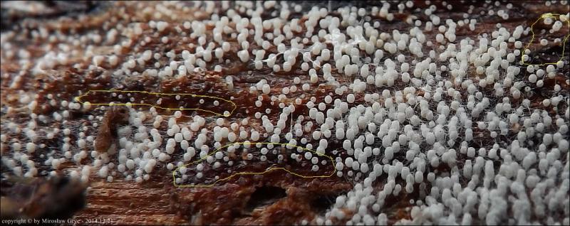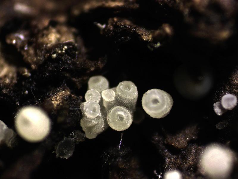 Diminutas fructificaciones de color blanco con forma de tubo corto, de tan solo entre 0,16 a 0,39 mm. de ancho, por entre 0,35 a 0,50 mm. de alto.