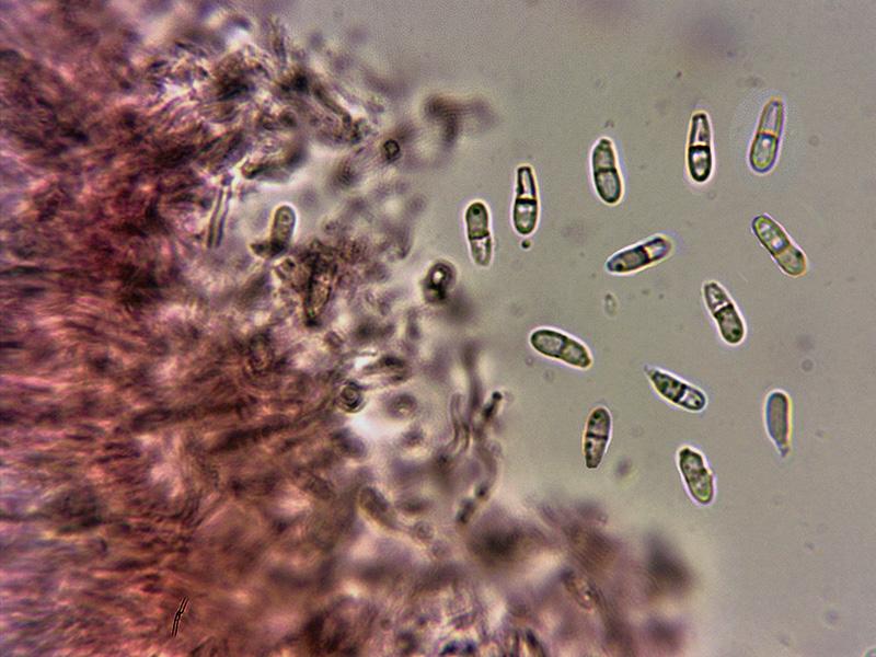 Conidios cilíndricos, con un septo y con un extremo redondeado y el otro algo apuntado, con unas medidas de (7.5) 8.2 - 9.2 (9.8) × (2.7) 2.8 - 3.3 (3.5) µm.